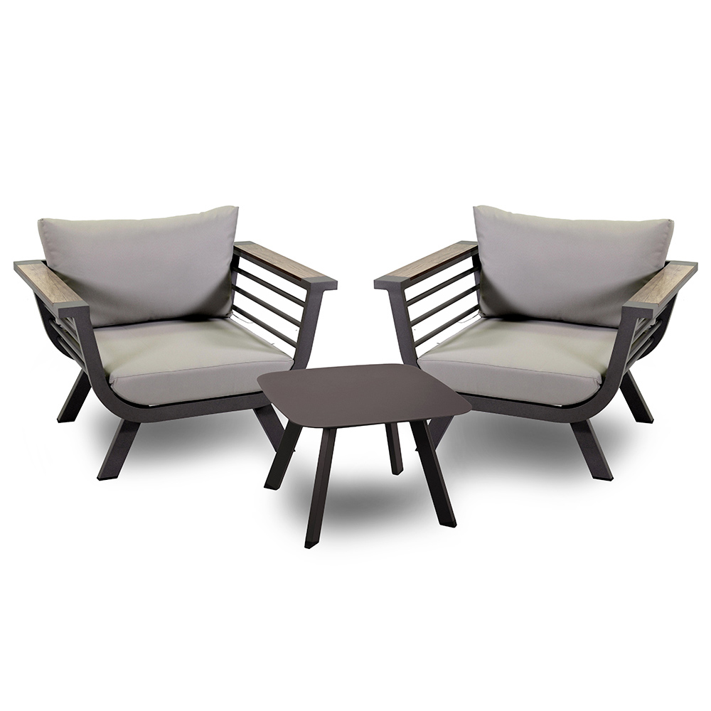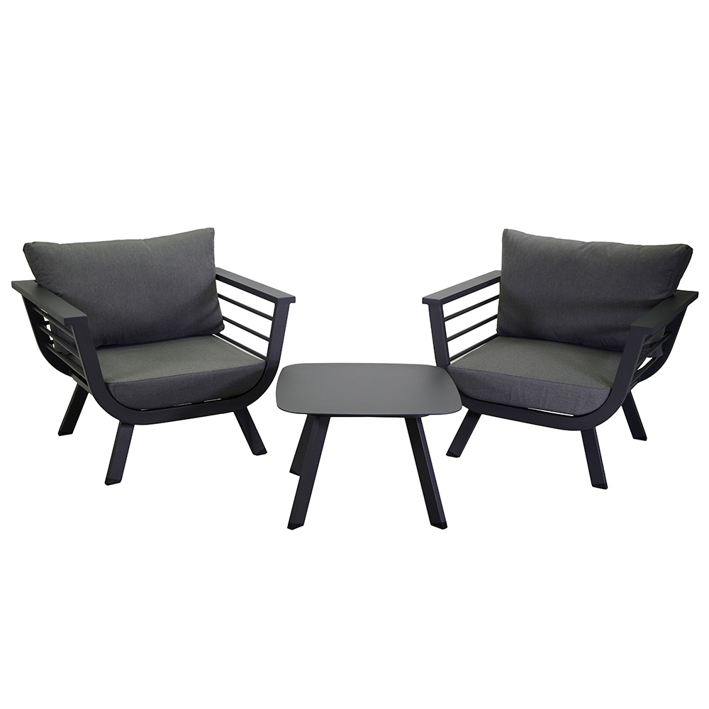 Fördjupa dig i komfort och stil med detta loungeset i aluminium , perfekt för alla utomhusutrymmen. Detta set innehåller två rymliga fåtöljer med kuddar som erbjuder den ultimata komforten och stödet. Det matchande soffbordet är perfekt för att hålla drycker och böcker inom räckhåll, vilket gör ditt utomhusutrymme till en sann oas av avkoppling.