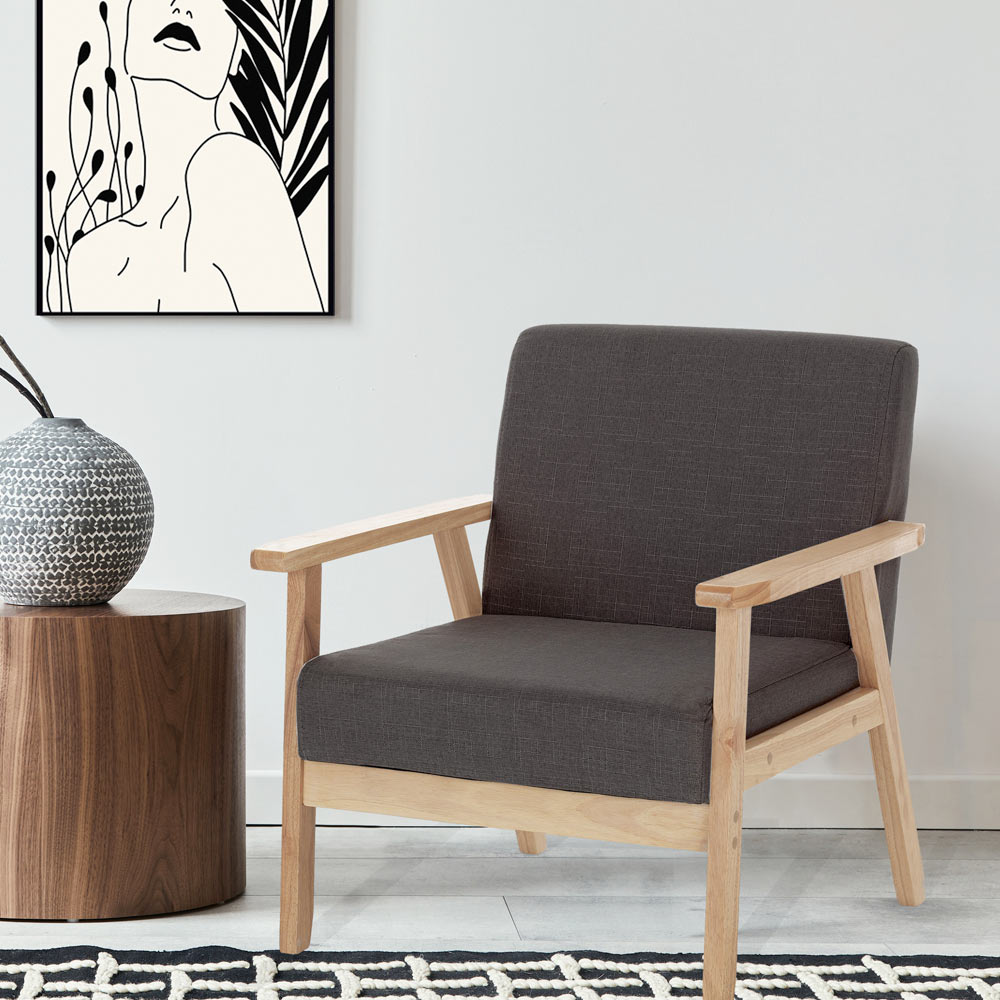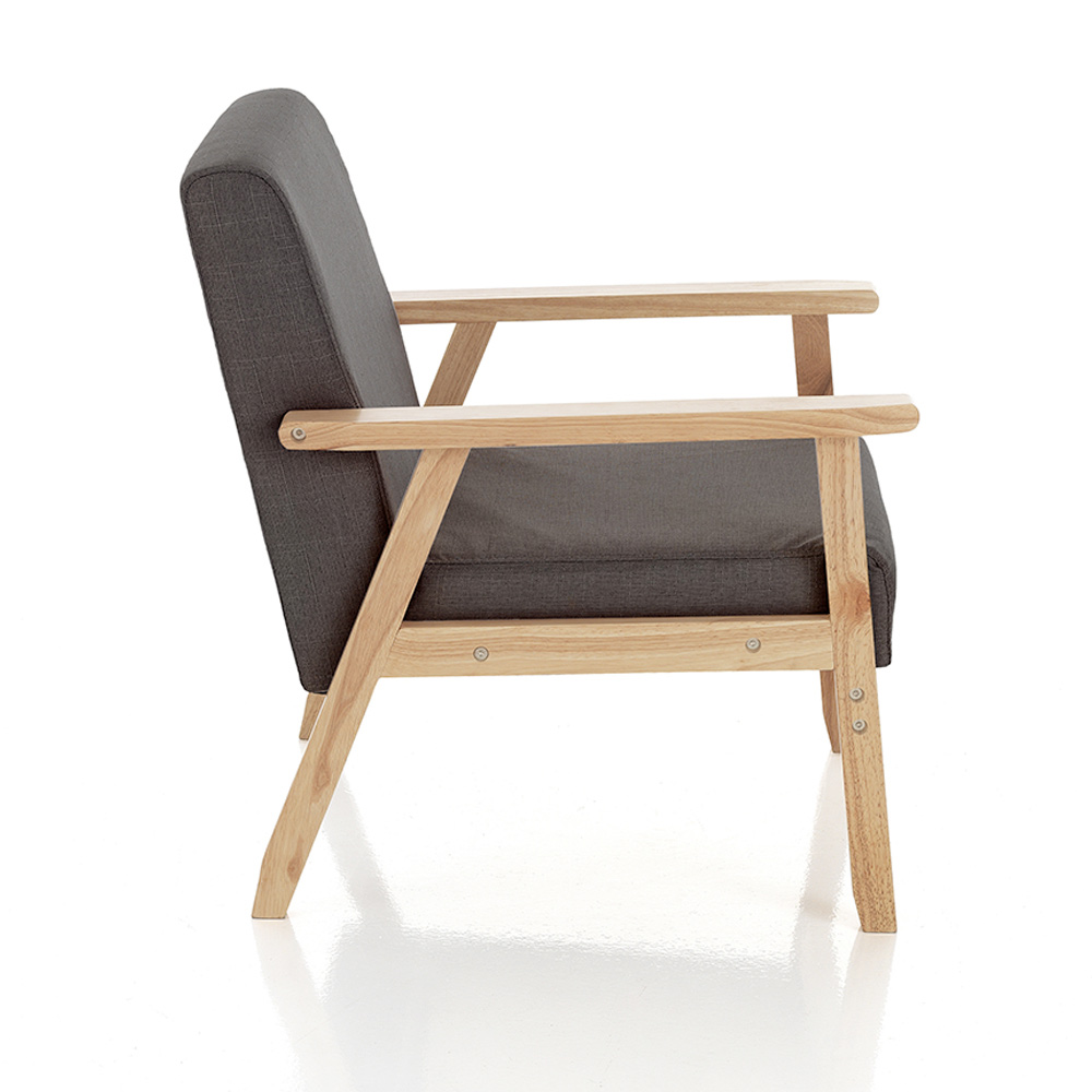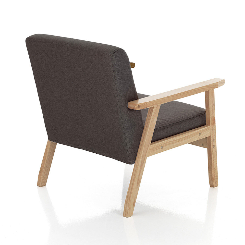 Denna fåtölj kombinerar elegans och komfort med en ren och modern design. Tillverkad med en massiv trästruktur ger den exceptionellt motstånd och ett varmt utseende som inbjuder till avkoppling. Kontrasten med den mörkgrå tygklädseln ger en touch av modern sofistikering till alla utrymmen.