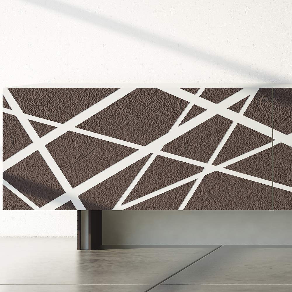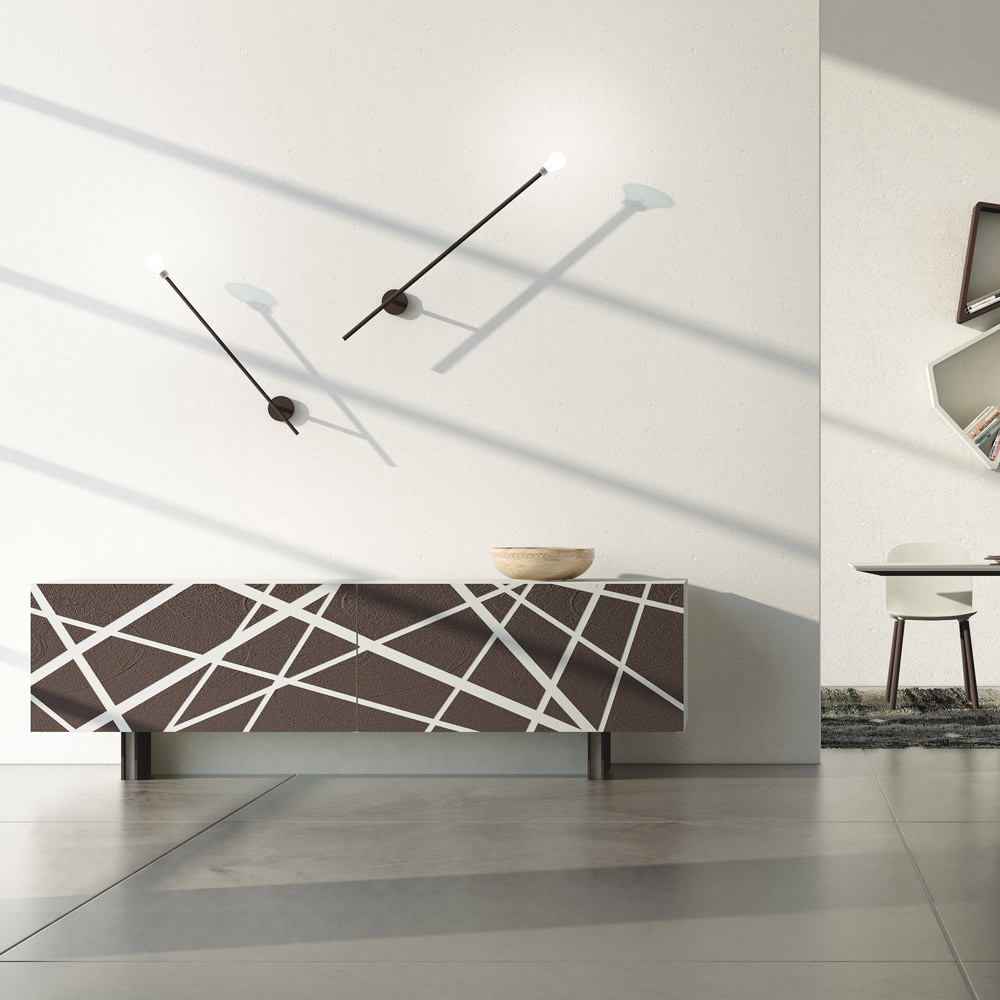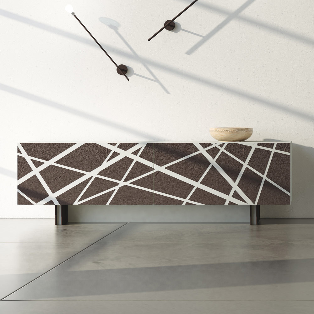 Vardagsrumsskänk med MDF-struktur i lermelamin invändigt och vulkanbrun mattlackad utvändigt. Öppningssystemet har 2 skjutdörrar i samma plan och amorteras vid öppning och stängning för att garantera perfekt funktionalitet och praktiska egenskaper . De invändiga hyllorna är avtagbara och i 8 mm tjockt glas medan fötterna är i metall . Denna produkt är full av smak och design tack vare föreningen av olika material, dess eleganta och raffinerade finish och utsmyckad av dekorationen på dörren med vit basrelief. Alla material som används för konstruktionen erbjuder hög kvalitet och motstånd över tid, vilket ger produkten den unika och oförglömliga touchen.