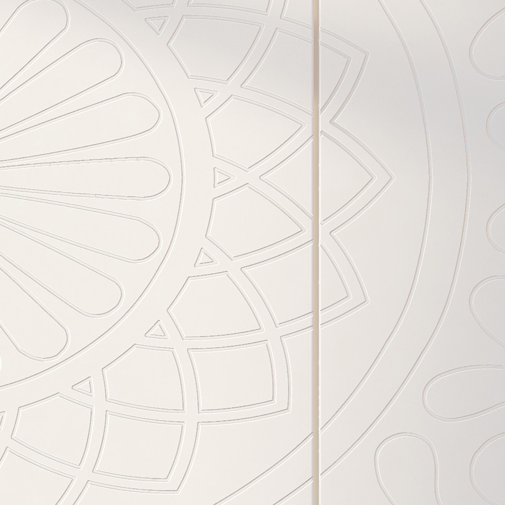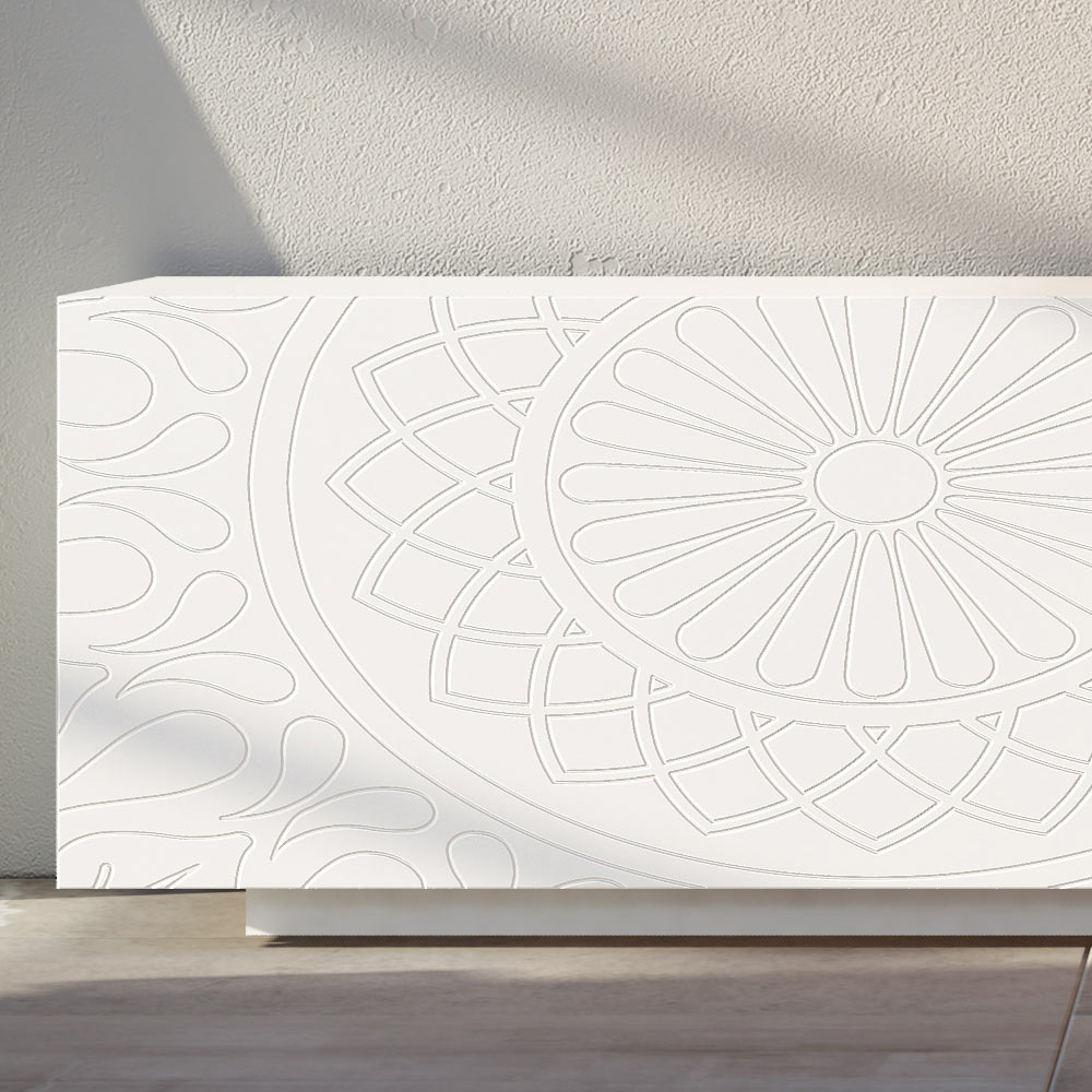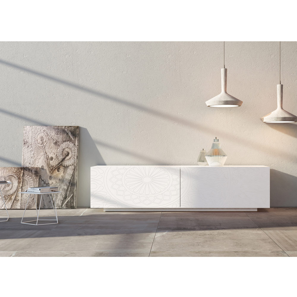 Modern skänk med vit mattlackerad MDF- struktur bestående av 2 skjutdörrar i samma plan som garanterar stor funktionalitet och funktionalitet och från den lackerade sockeln som erbjuder mycket stabilitet. Denna produkt är full av smak och design tack vare dess eleganta och raffinerade finish och basreliefdekorationen på dörrarna som gör dem unika i sitt slag. De olika materialen som används för konstruktionen erbjuder hög kvalitet och motstånd över tid, vilket ger produkten den unika och oförglömliga touchen.
