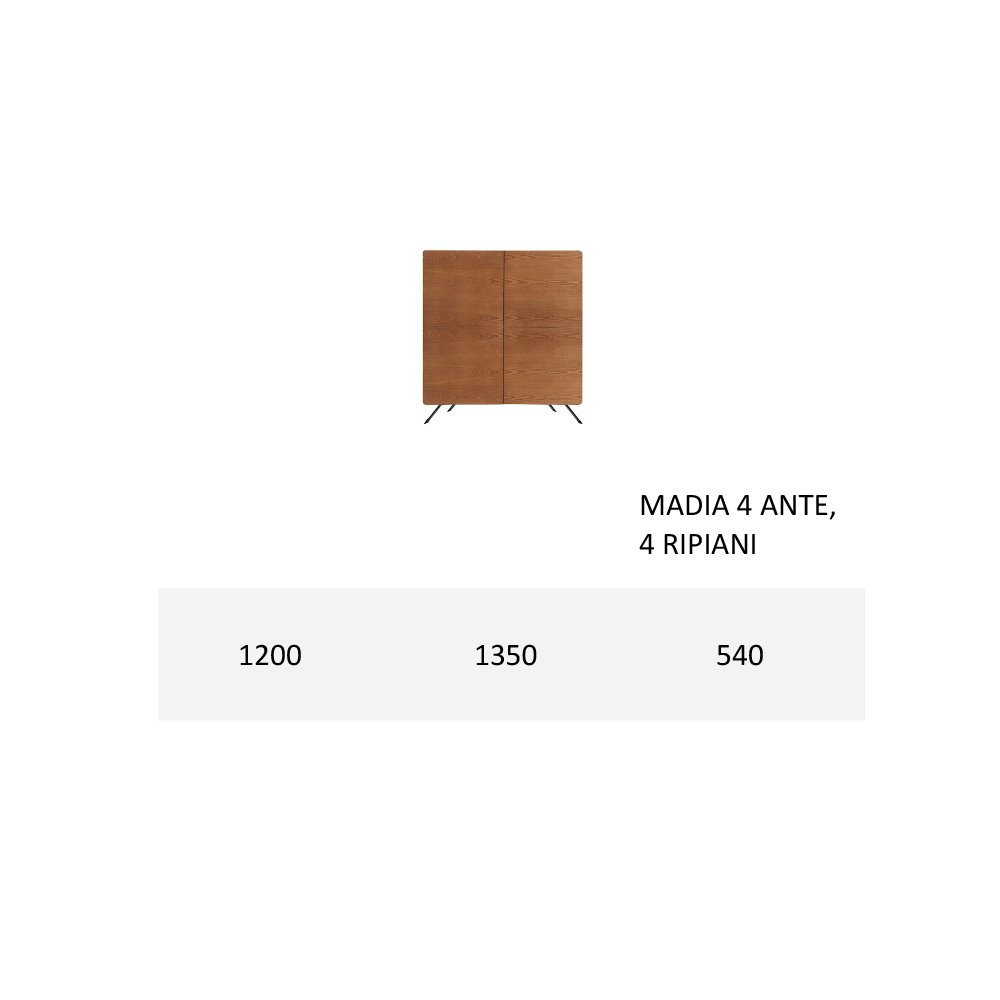 Vardagsrumsskänk helt tillverkad i Italien bestående av en bas med 4 järnfötter i kolfinish , skal i mdf med kolfinish och baksida i massivt trä komplett med 4 dörrar i betsad ask blockboard med 4 hyllor i mdf . Användningen av enkla men motståndskraftiga material förvandlar denna produkt till en möbel med stor mångsidighet och ett attraktivt och intressant utseende.