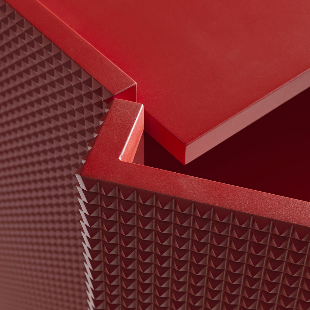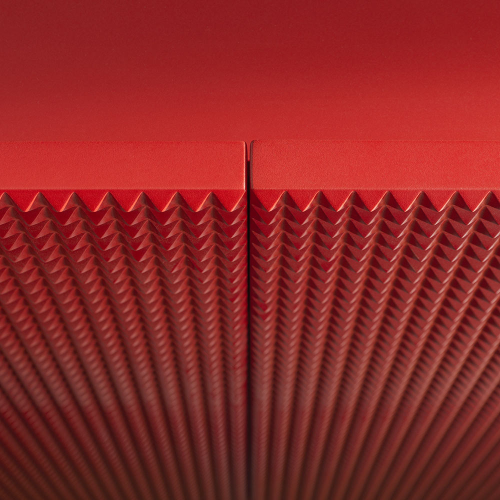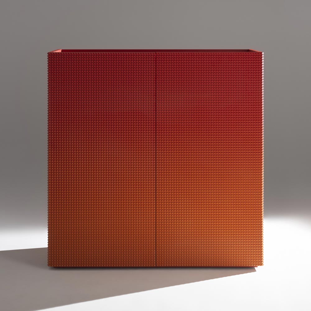 Ett skulpturalt verk som kombinerar materialitet och förfining , i perfekt balans mellan estetik och funktionalitet . Detta skänk med två dörrar utmärker sig med sin ikoniska orange/röda "diamant"-finish , en visuellt slående tredimensionell design, handslipad före den slutliga lackeringen för att uppnå en livfull och extremt sofistikerad yta.
