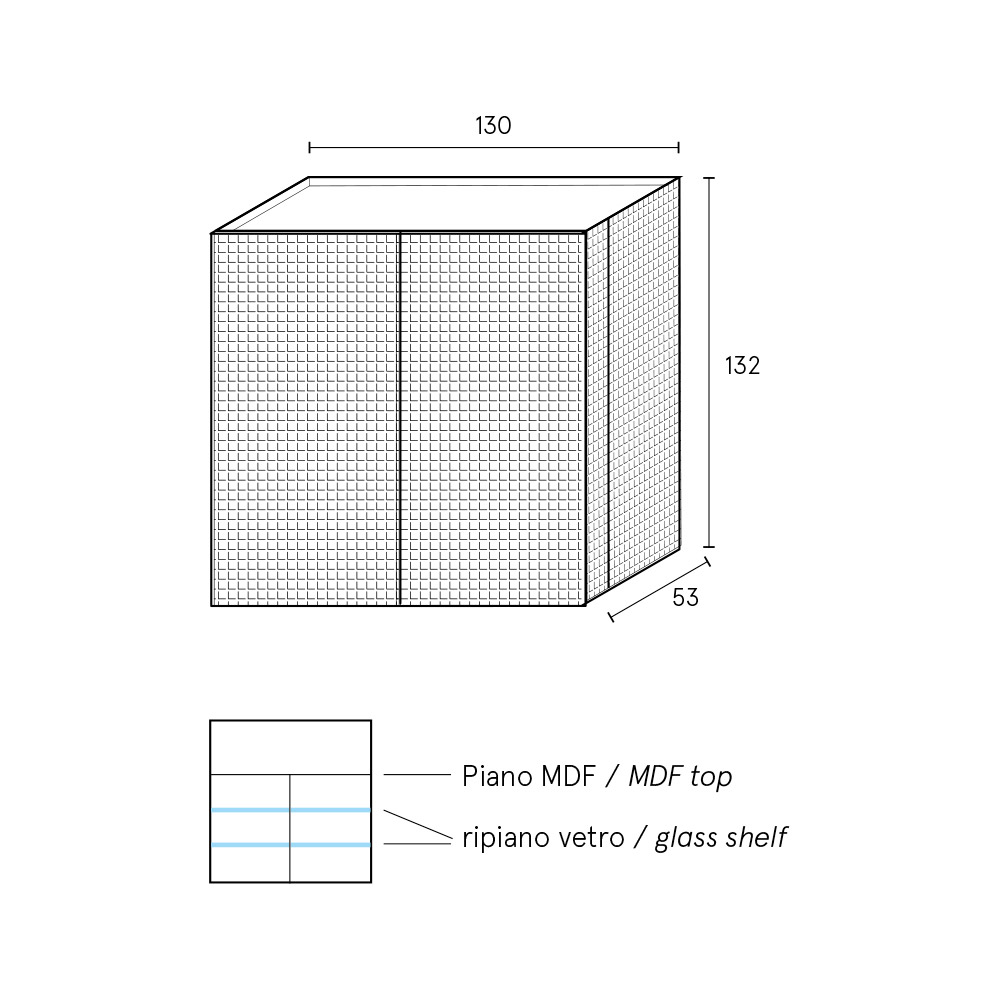 Dörrarna öppnas på sidorna med infällda gångjärn , en lösning som säkerställer formell renhet och kontinuitet i linjerna. Den färdiga bakpanelen möjliggör placering även i mitten av rummet , vilket förvandlar verket till ett verkligt arkitektoniskt element.