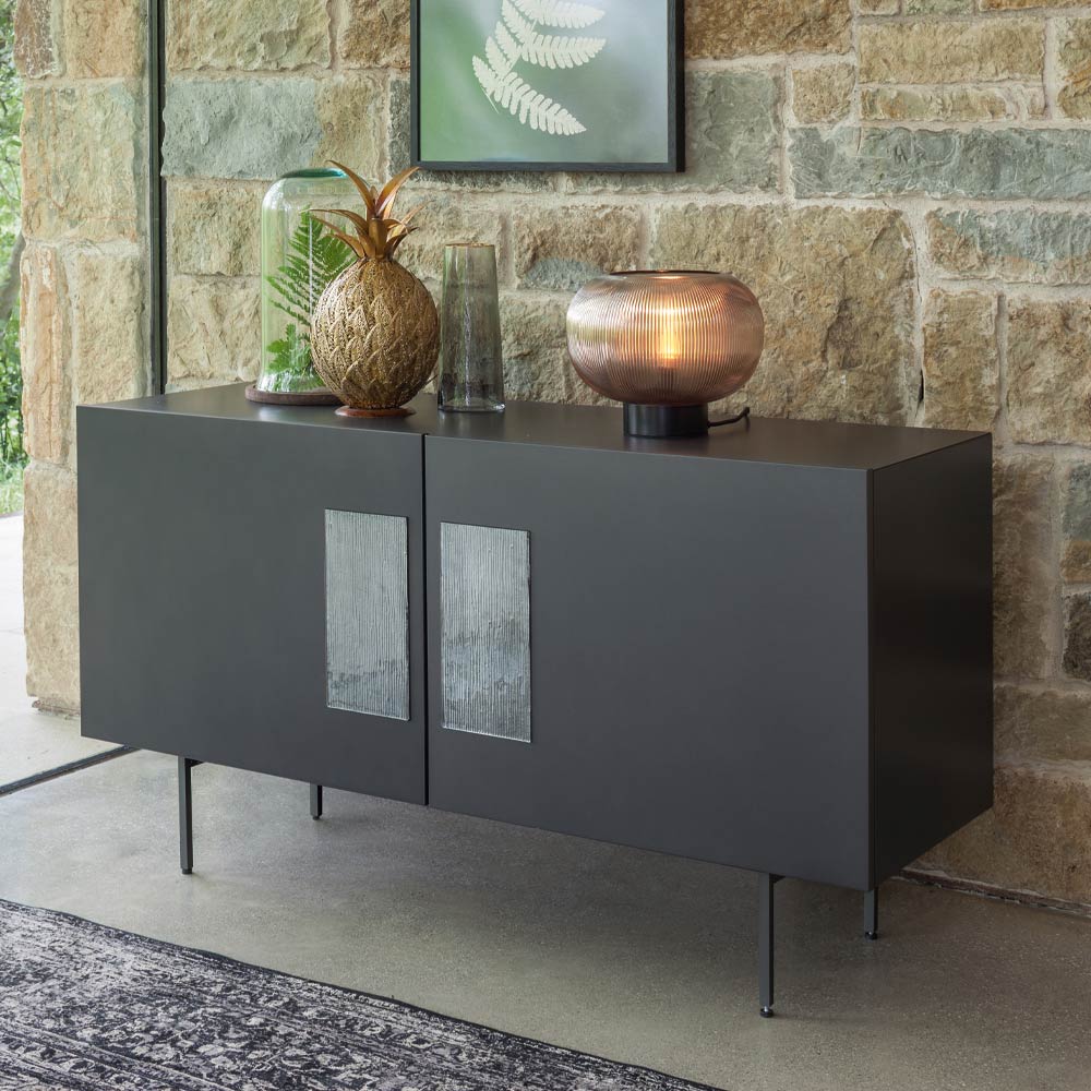 Made in Italy. Den sticker ut för sin väsentlighet, för sin rena och linjära design som fångar uppmärksamheten hos även de mest krävande observatörerna. Skänken har värdefulla detaljer, som glasinsatserna på de lackerade luckorna som tillför en touch av elegans och förfining. Denna skänk erbjuder en snygg och funktionell förvaringslösning, med interna hyllor som ger utrymme för att organisera personliga föremål eller hushållsartiklar. Glasinsatserna skapar en vacker kontrast med den lackerade finishen, vilket gör denna möbel till ett sofistikerat val för alla moderna miljöer.