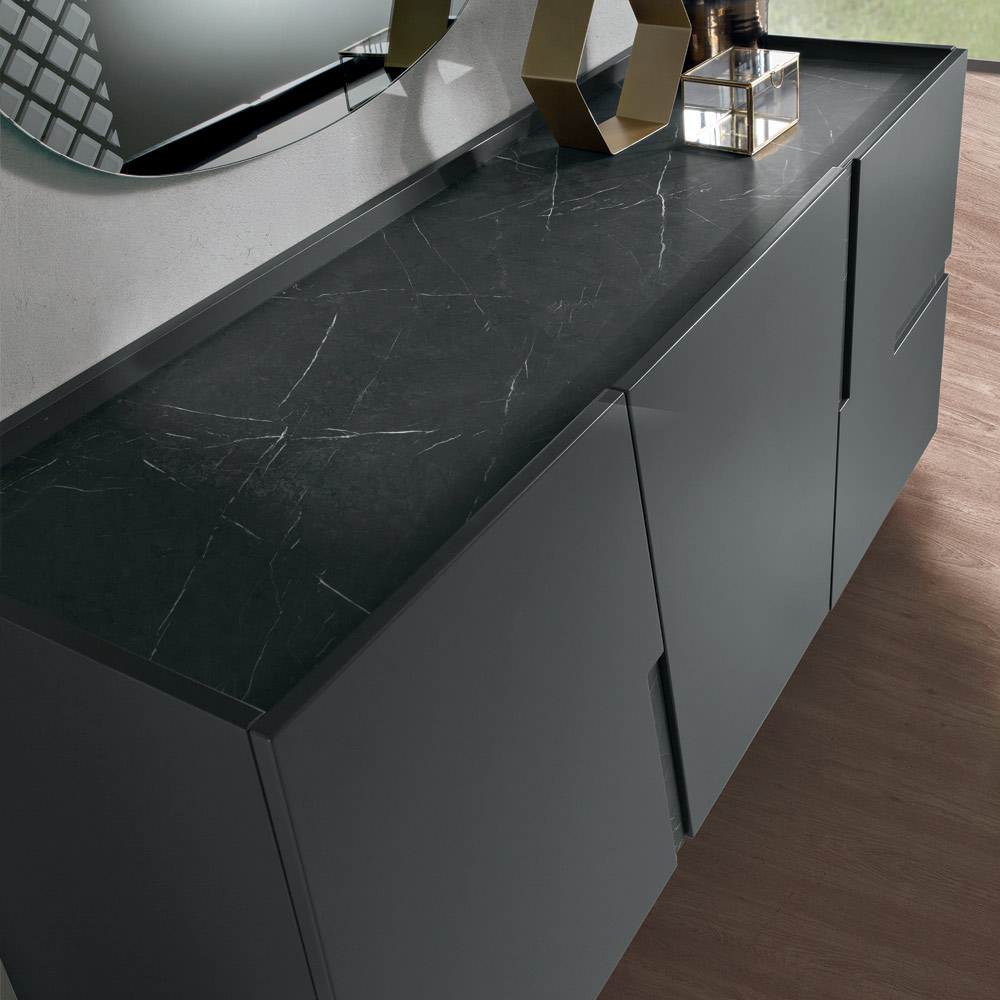 Strukturen är tillverkad med en melaminstomme och lackerade MDF-dörrar , vilket skapar en enhetlig och elegant yta. Designen är utsmyckad med dekorativa inlägg och kontrasterande toppar , tillgängliga i finishar som marmoreffekt , teakeffekt eller bronsspegel , vilket ger djup och karaktär till kompositionen.