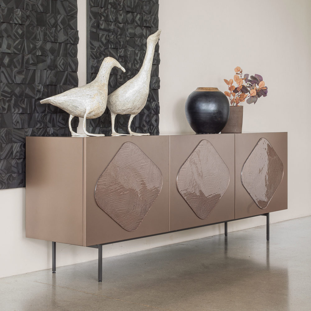 Made in Italy. Fusion av elegans och funktionalitet som förstärker skönheten i moderna miljöer. Den utmärker sig för sin högkvalitativa lackfinish, som erbjuder en slät yta och ett glansigt utseende som attraherar ögat. Valet av lack är inte bara estetiskt utan också praktiskt, eftersom det ger långvarigt skydd mot dagligt slitage, vilket håller skänken vacker över tiden. Designen förstärks ytterligare av de tunna