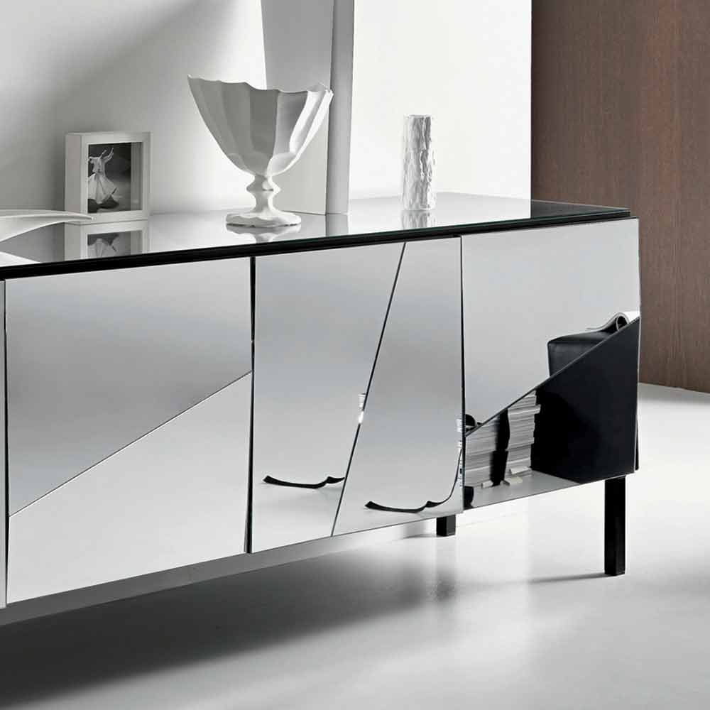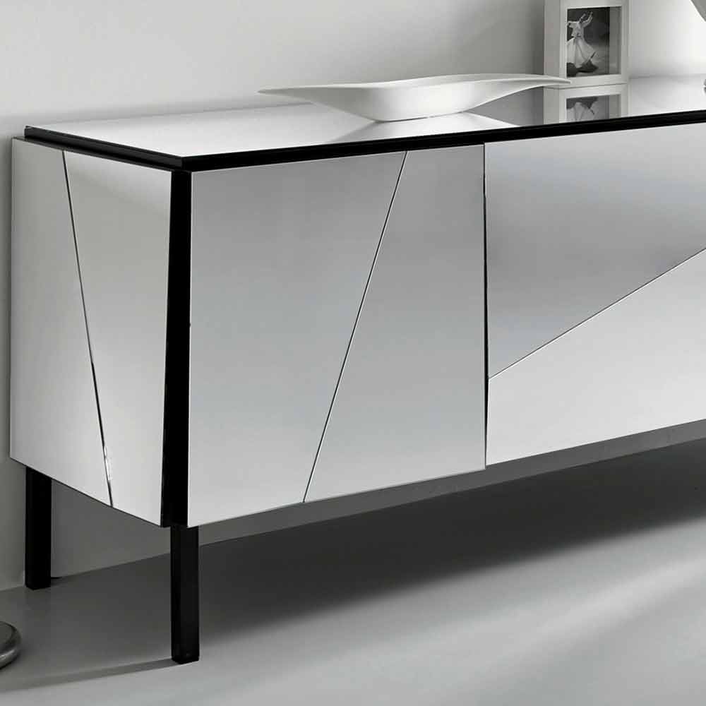 Tillverkad med en struktur och fötter i matt svartlackerat trä, är spegeleffekten total tack vare glasbeklädnaden med konkava och konvexa speglar som gör den elegant och sofistikerad, vilket ger en touch av mästerskap och gästfrihet för miljön.