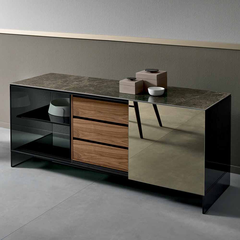 Modern och lyxig stilskänk med smookey glasstruktur och bronsspegeldörr, realiserad för hand i Italien.
