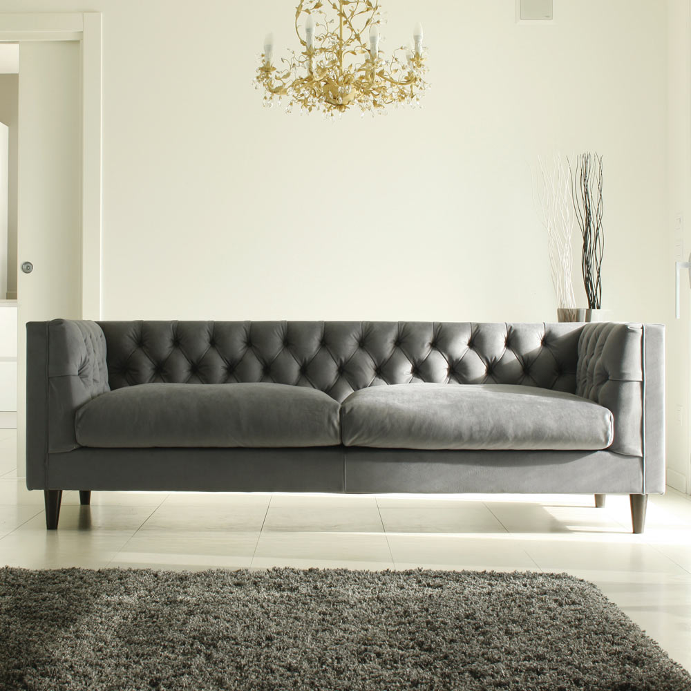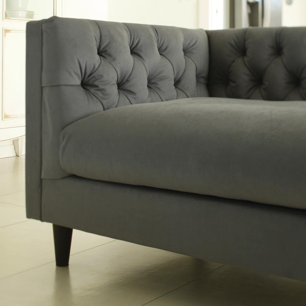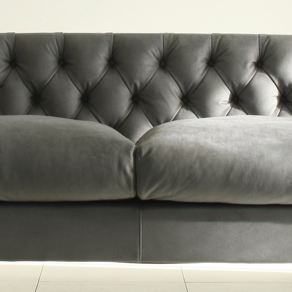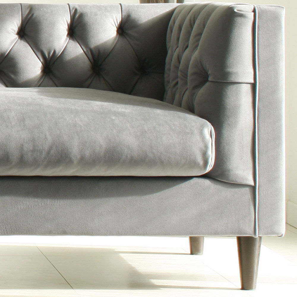 bokträ. Soffan kombinerar klassicism med en modern och förfinad look. Dess knäppta tuftning och rundade armstöd framkallar elegans, medan träramen och den generösa stoppningen säkerställer komfort. Kvalitetsklädseln, tillgänglig i olika färger, berikar soffans utseende. De tunna träbenen ger en modern touch, vilket gör soffan lämplig för både traditionella och moderna interiörer, vilket ger den en mysig och sofistikerad atmosfär.