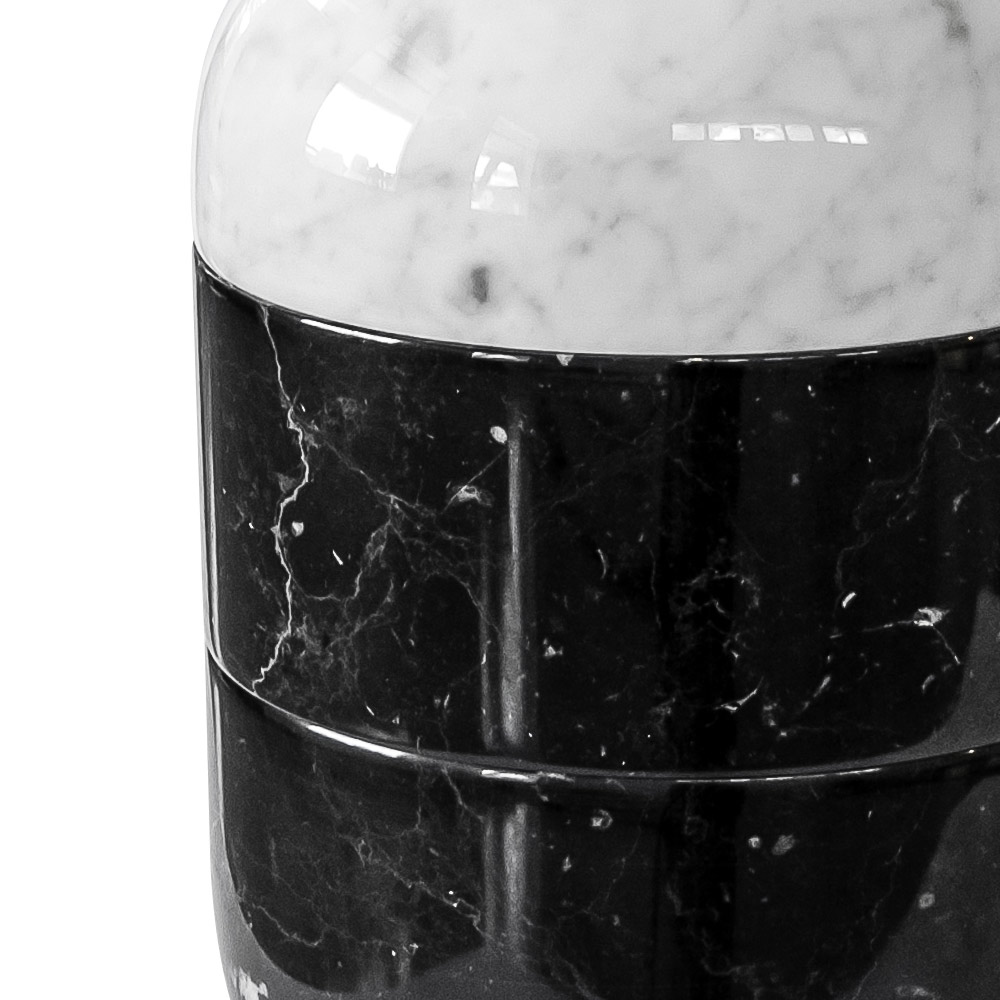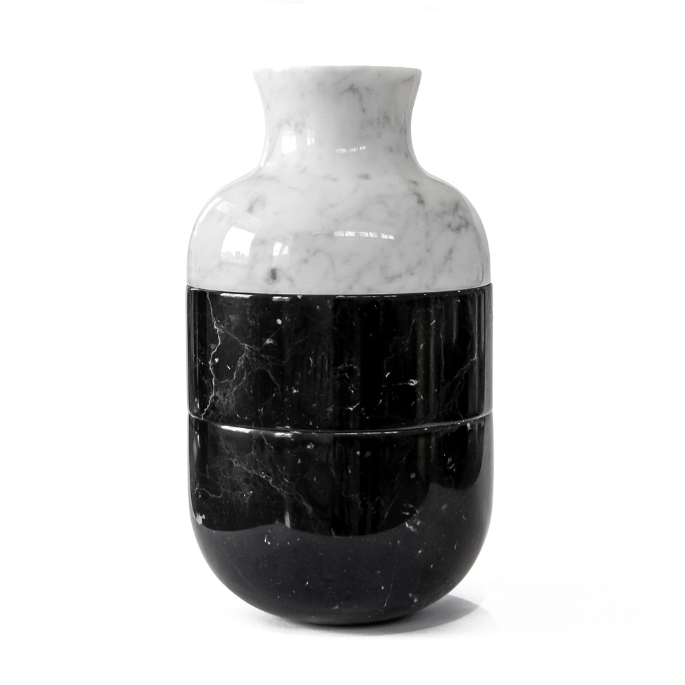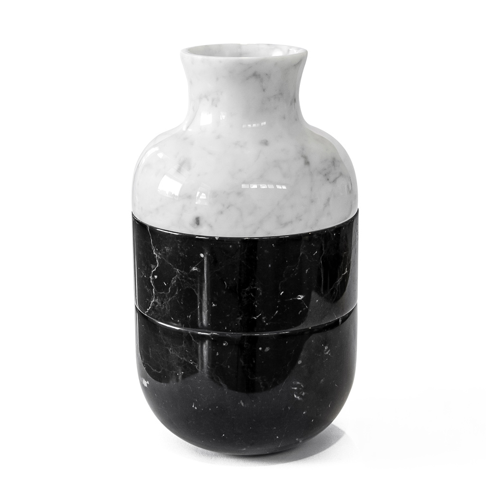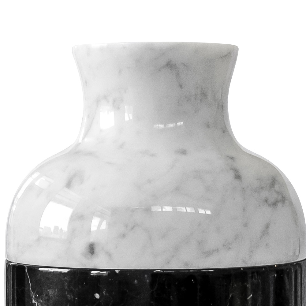 Denna dekorativa vas har en hantverksmässig och lyxig design uppdelad i 3 delar, helt gjord av vit Carrara och svart Marquinia satinmarmor.