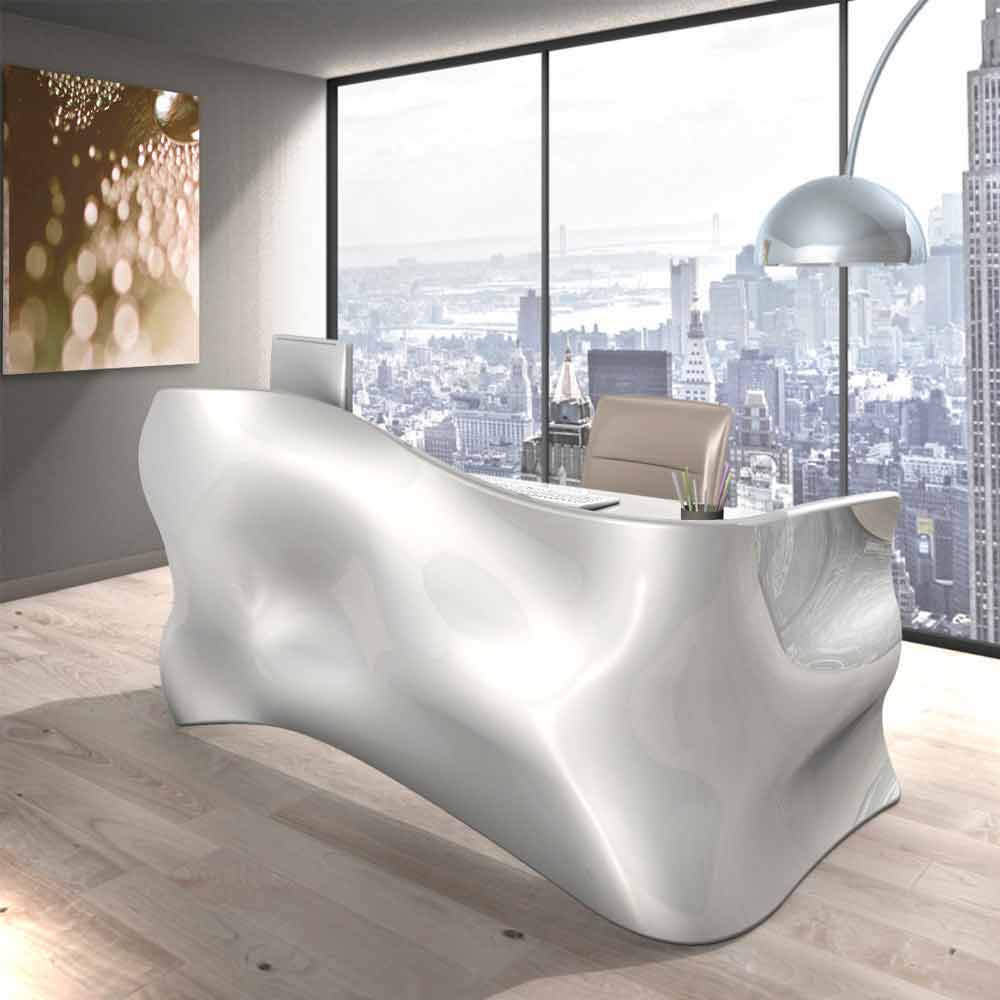 "Velo" skrivbordet designades för att kombinera funktionalitet och stark estetisk effekt. Den kännetecknas av en design med organiska och slingrande linjer, nästan som en mjuk slöja, som viker och omsluter det omgivande utrymmet. Dess skulpturala form är sådan att den kan sättas in både i moderna och minimala miljöer och i lyxiga rum av högsta nivå. Skrivbord som kännetecknas av Solid Surface, finns i tre färgvarianter: Vit (RAL9003), Svart (RAL9005), Dove Grey (RAL1019), välj den som passar dig bäst!