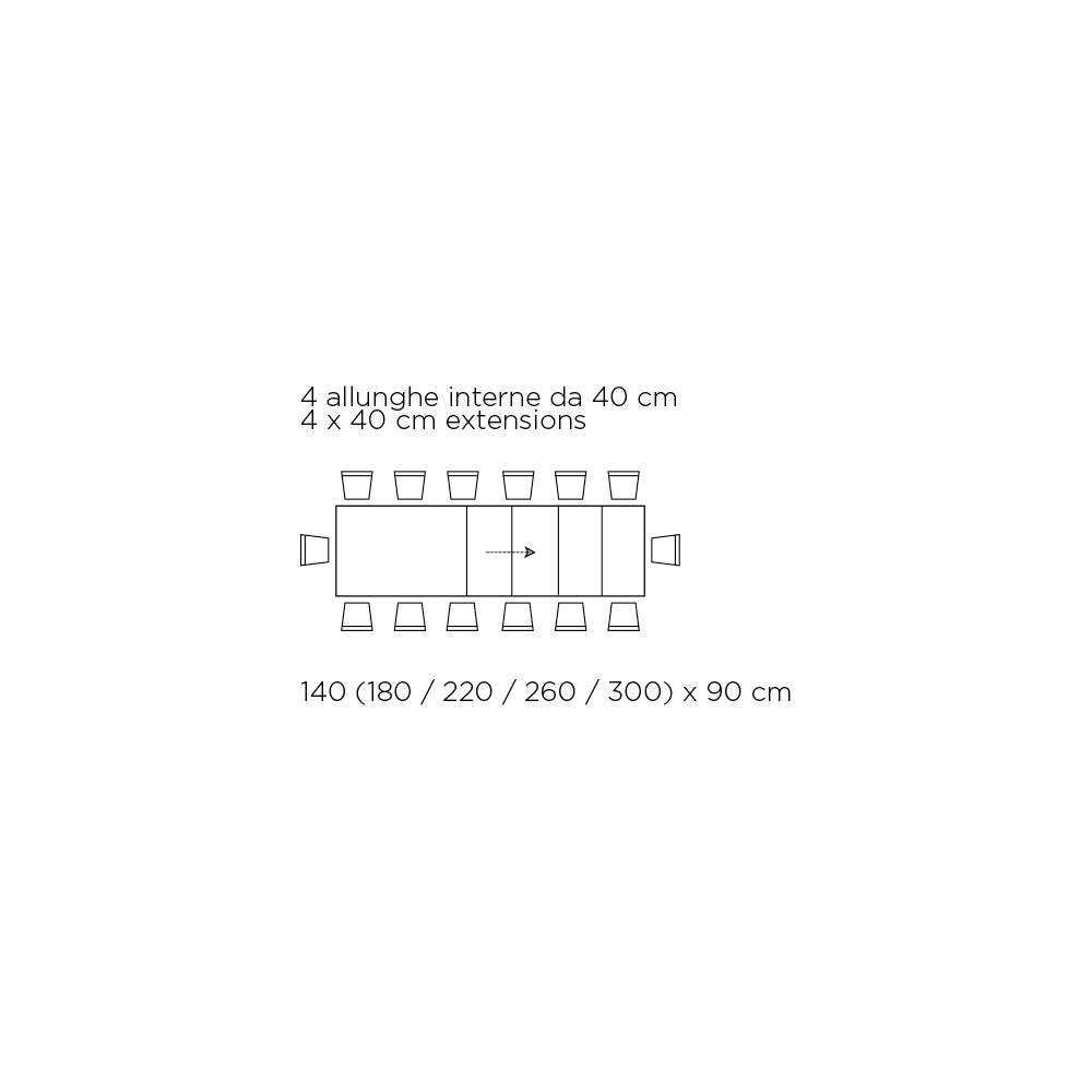 - L 140 (300) x D 90 x H 75 cm 14-sits utdragbar med fyra invändiga förlängningar på 40 cm vardera;