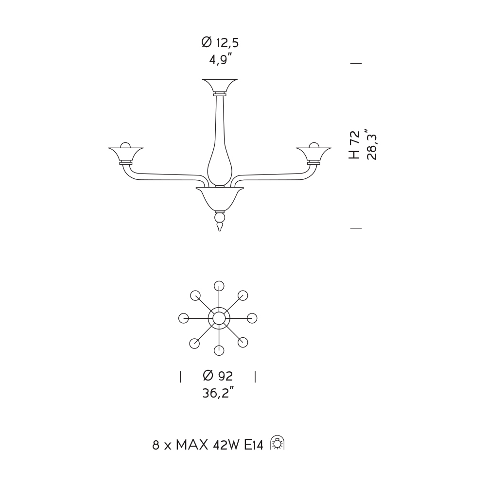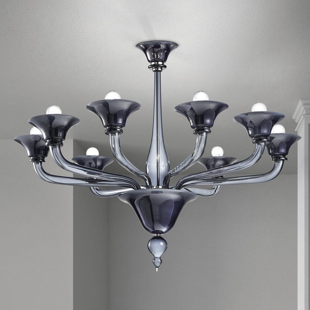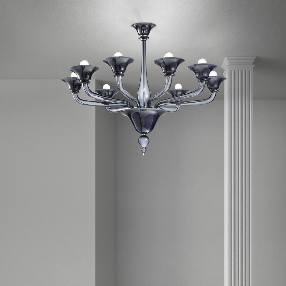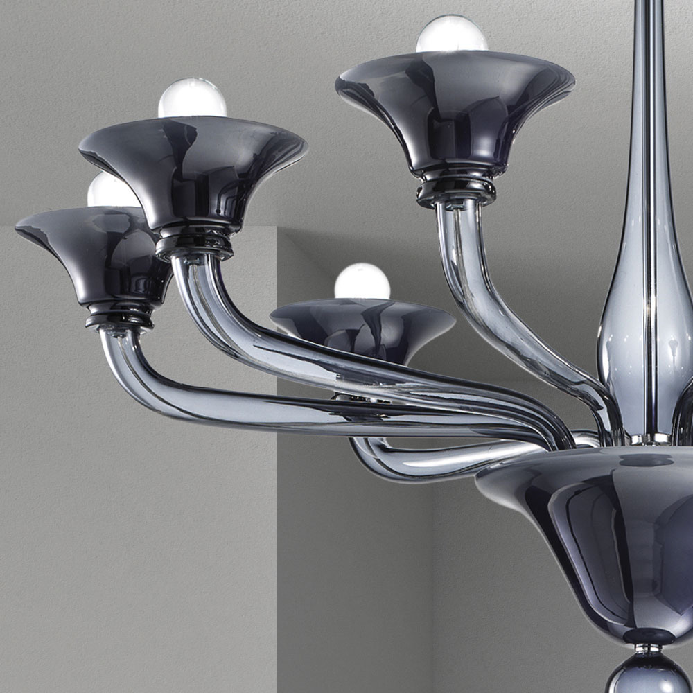 Ljuskrona handgjord i Italien i Venedigglas med mjölkvit-grå finish med metalldetaljer i polerad kromfinish . Ett aldrig tidigare skådat möte mellan historiska linjer och modern design för att ge liv åt en möbel med tidlös charm och elegans. Dess estetik kännetecknas av en ledad volym som blir dynamisk och lätt genom den lysande vibrationen från de fantastiska blåsta glasytorna som varvar de eleganta genomskinliga armarna med kopparna gjorda med hjälp av höljestekniken . För att understryka dess värde är uppmärksamheten på detaljer som framgår av de kromade metallkomponenterna som gör att produkten kan anpassa sig till olika smaker och användningssituationer.
