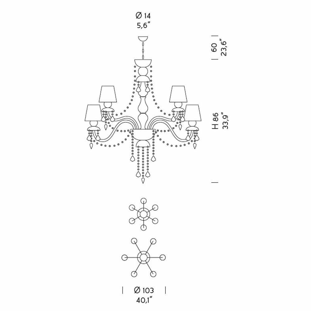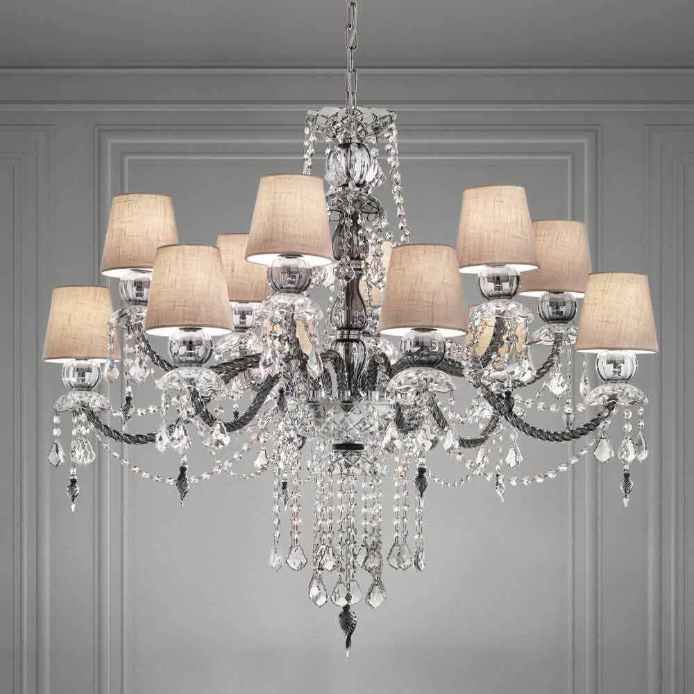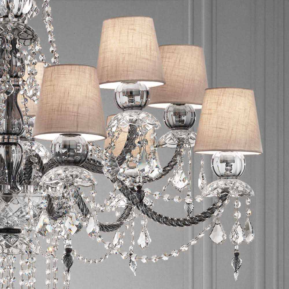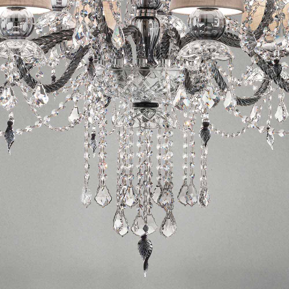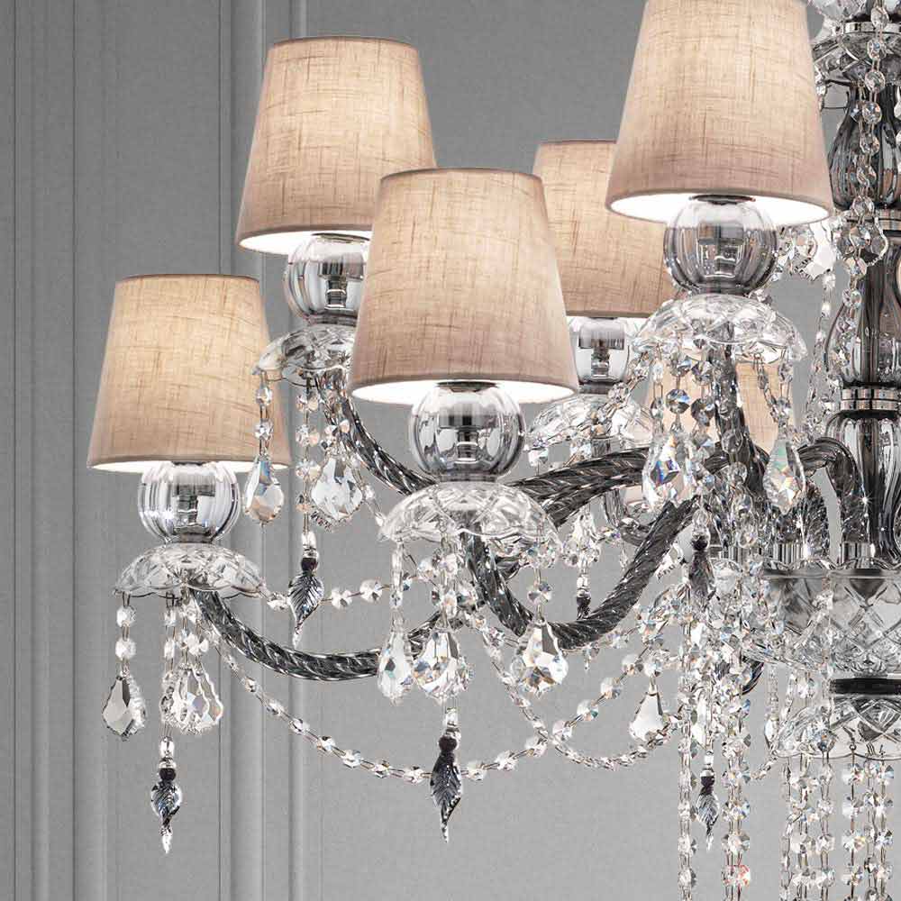 Elegant och imponerande ljuskrona med 12 lampskärmar av linne , struktur i venetiansk glasgrå finish berikad med hängen i kristallfinish och detaljer i polerad krommetall , handgjord i Italien . Denna ljuskrona karaktäriseras av en romantisk karaktär som kan fylla stora rum på ett exklusivt sätt, tack vare lysande hängen och raffinerade lampskärmar som ger liv till en dynamisk inredningslösning med stark scenografisk påverkan . För att öka dess värde och för att understryka dess estetiska sida är närvaron av paljetter, som genom ljusets refraktion ger liv till underbara spel av ljus och skugga tack vare oöverträffade färgade blixtar .