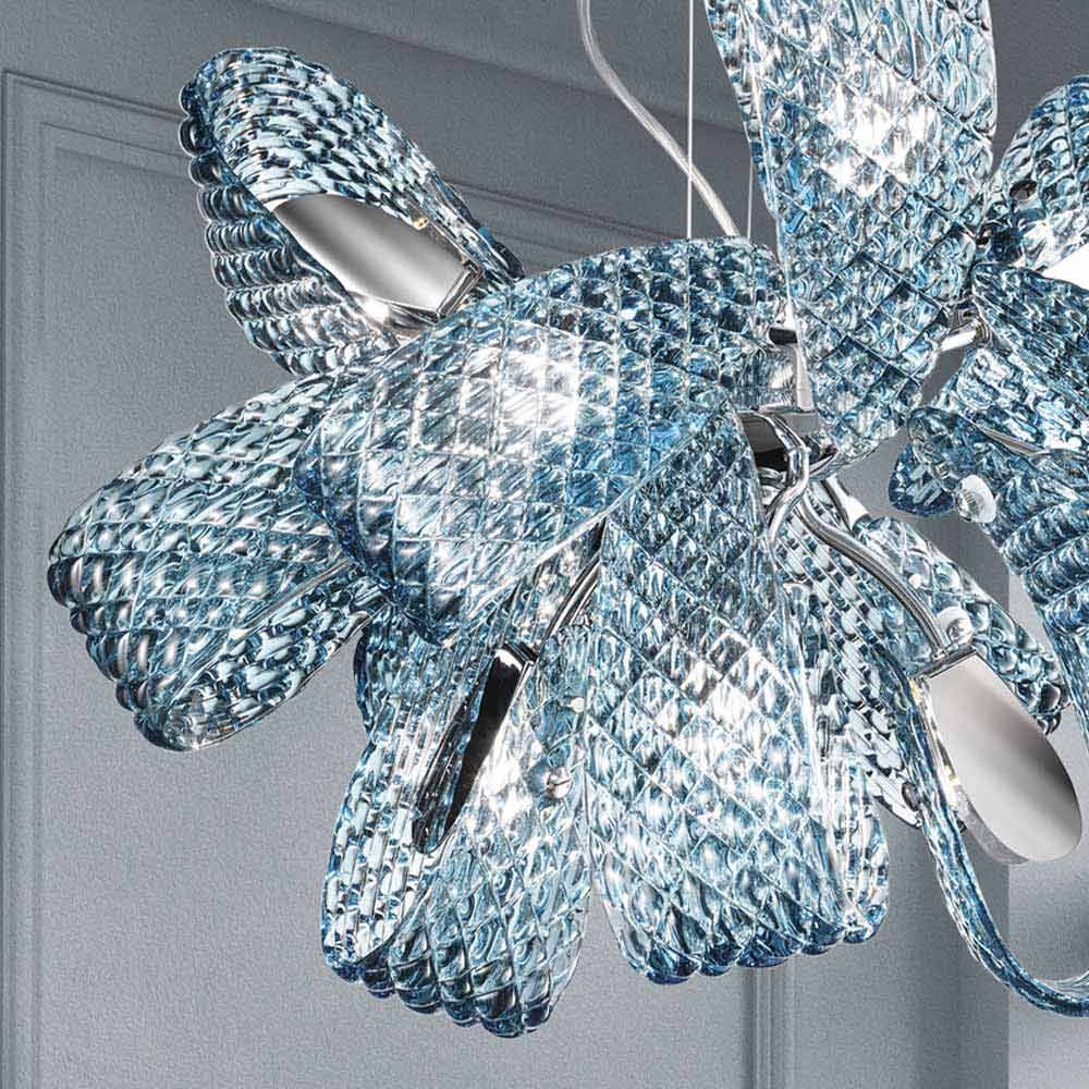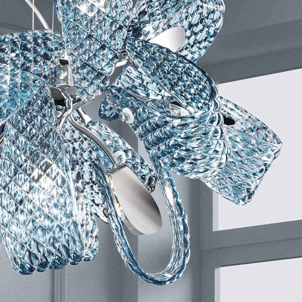 Ljuskrona med 9 ljus handgjorda i Italien i Venedig med glasfönster i blå yta och detaljer i polerad krommetall. En idé om belysning som består av vällustiga band och ovanliga texturer som ger dess estetiska originalitet och en känsla av dynamik . Tack vare den excentriska och raffinerade designen och metallinsatserna som skapar kontrast med glaset, föddes en exklusiv ljuskrona som kan karakterisera alla miljöer med en touch av lätthet, som ger liv till underbara ljusspel .
