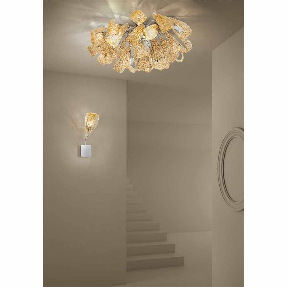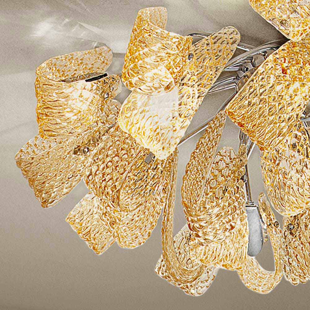 Elegant och majestätisk taklampa tillverkad i Italien i handgjorda venetianska glas med bärnstensfärgad finish med detaljer i polerad krommetall . En idé om belysning som består av vällustiga band och ovanliga texturer som ger dess estetiska originalitet och en känsla av dynamik . Det som är slående är den geometriska strukturen som täcker glasytan på vilken ljuset reflekteras i metalldetaljerna för underbara reflektioner . Resultatet är en underbar taklampa som kan anpassas till alla moderna miljöer och ge karaktär till mer klassiska utrymmen, vilket visar sig vara särskilt mångsidigt.