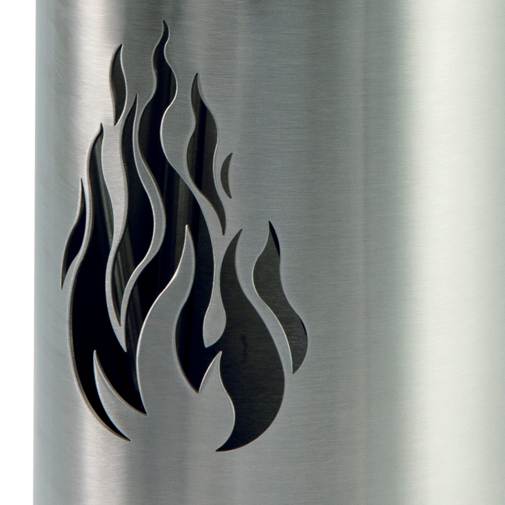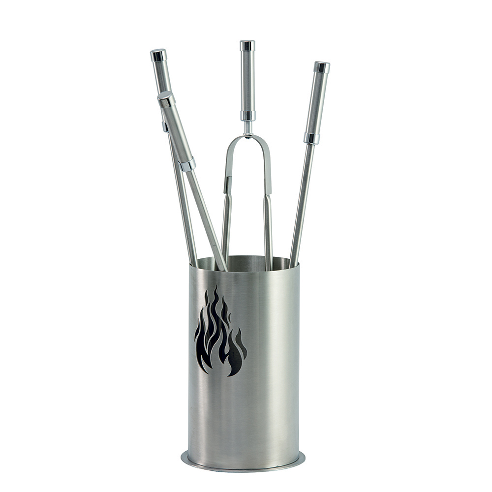 Denna eldstadsverktygshållare, tillverkad av högkvalitativt rostfritt stål, är ett måste för alla som vill kombinera funktionalitet och elegans. Dess moderna design, som kännetecknas av rena linjer och en iögonfallande flamformad snidning , gör den till ett riktigt konstobjekt, perfekt för att lägga till en touch av modernitet till den traditionella eldritualen.