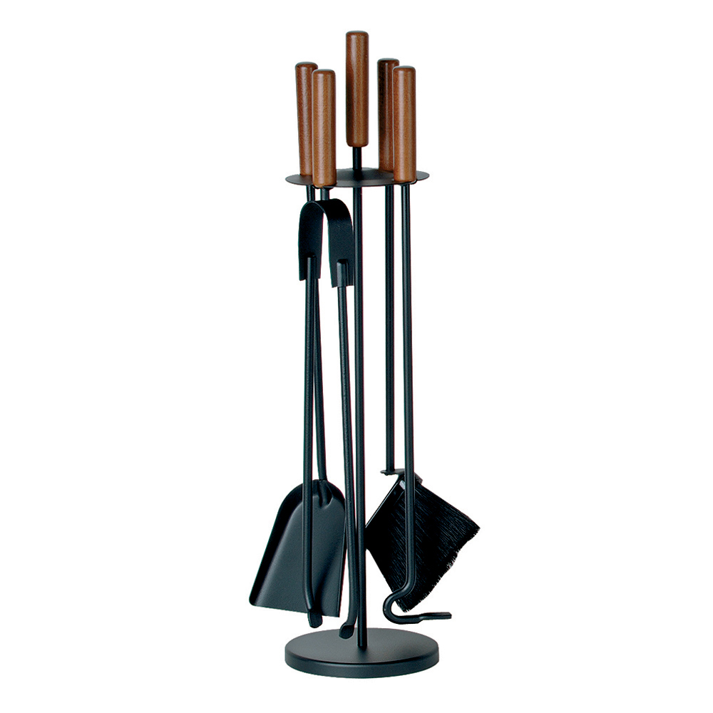 Denna uppsättning med spisverktyg kombinerar elegansen av klassisk design med den väsentliga funktionaliteten för att ta hand om hemmet. Den svarta metallstrukturen, som stöds av en solid cirkulär bas, är designad för stabilitet och hållbarhet. Trädetaljer på verktygshandtagen ger en touch av naturlig värme, kontrasterar snyggt med den matta metallfinishen och ger setet ett mysigt, raffinerat utseende.