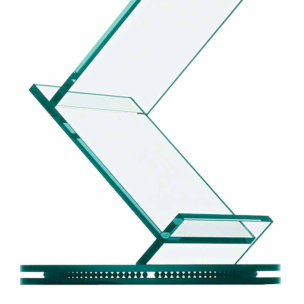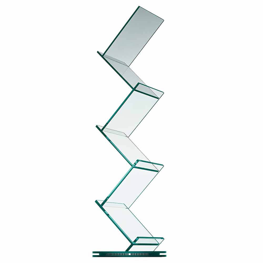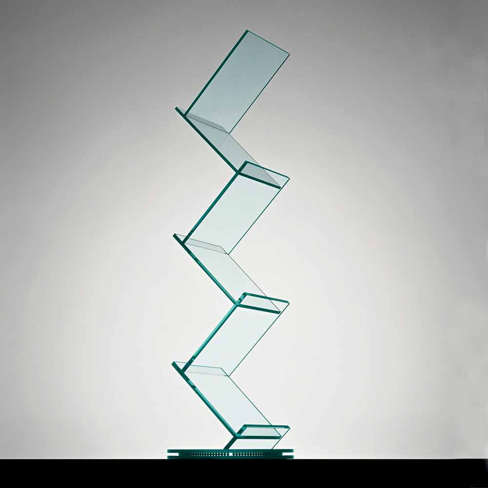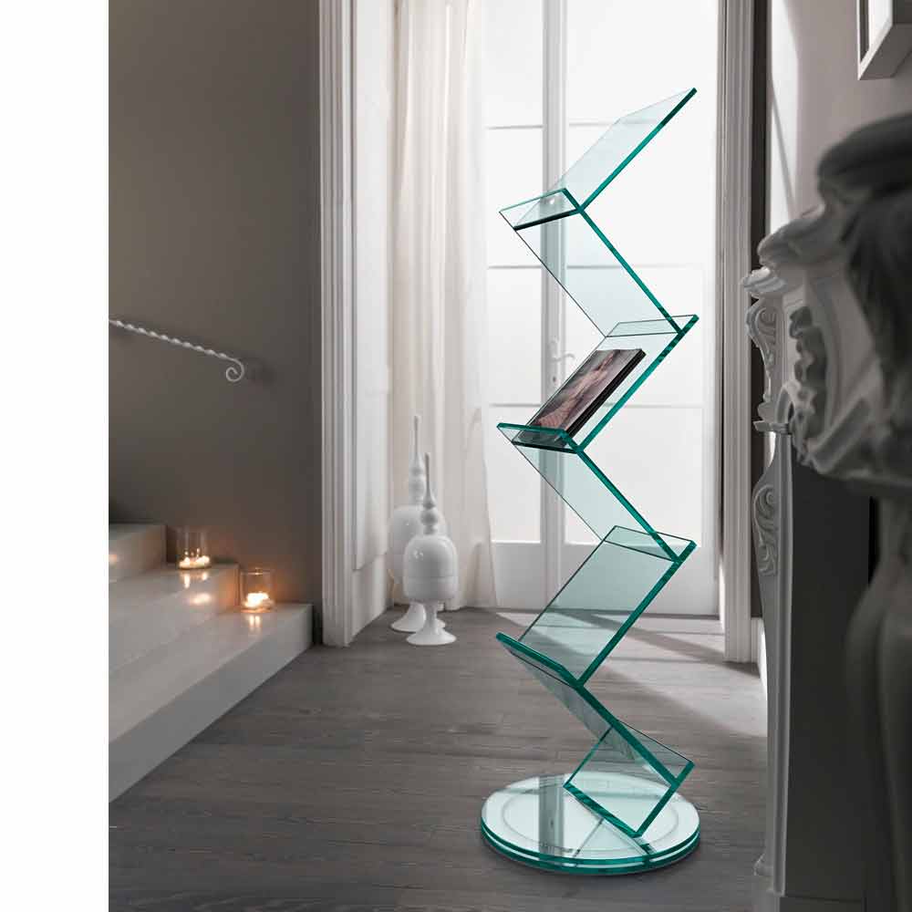Denna bokhylla för magasinställ kännetecknas av sin beslutsamma och eleganta design helt och hållet i transparent glas.