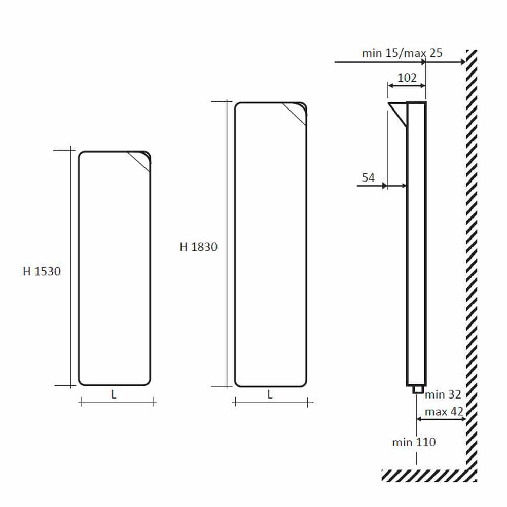 - H 1530 x L 375 x Inter. 50 x P 48 mm x Utgång w (At50 °) 385; Utbyte w (At30 °) 197; Utbyte w (At26 °) 166