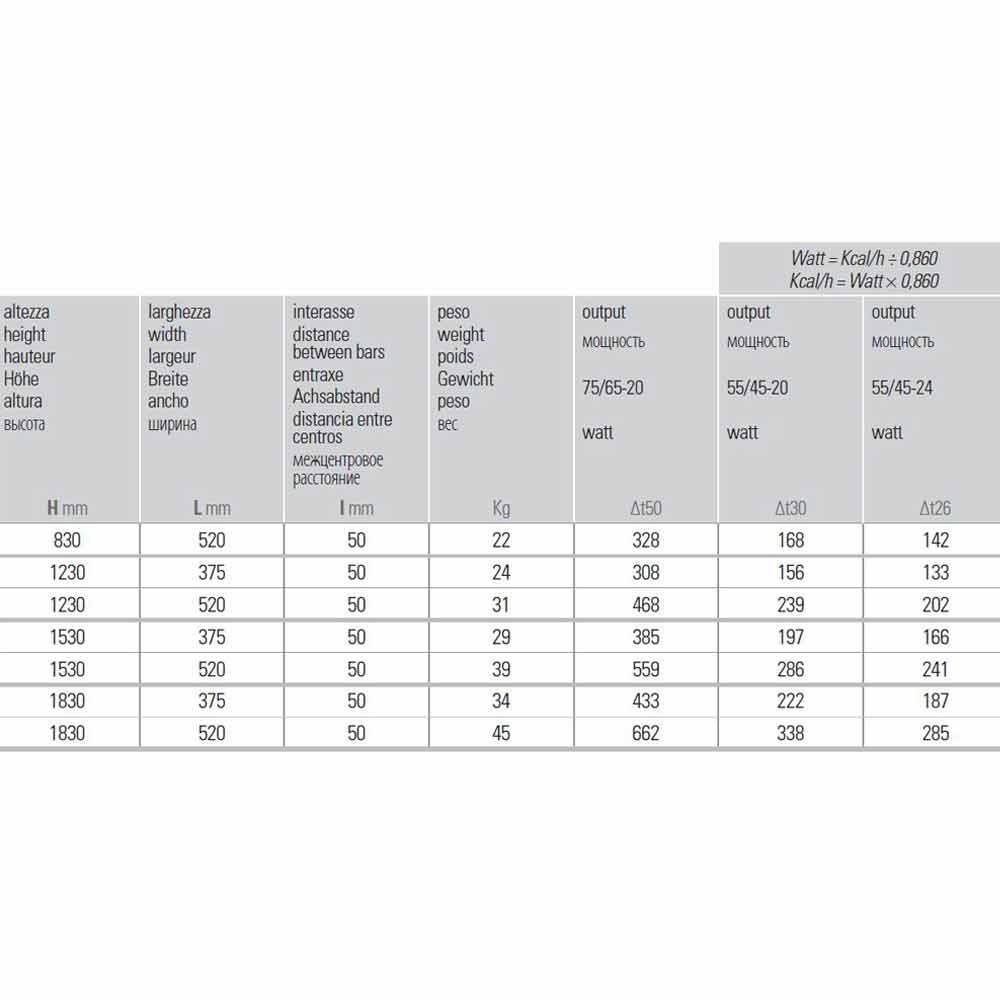 - H 1830 x L 375 x Inter. 50 x P 48 mm x Utgång w (At50 °) 433; Utbyte w (At30 °) 222; Utbyte w (At26 °) 187