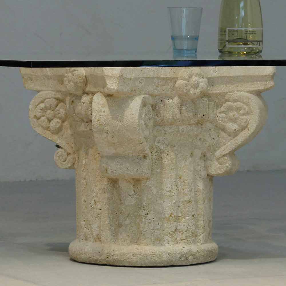 Classic kvadratisk soffbord Made in Italy med central bas i naturliga Vicenza sten, huggen för hand från det fasta kvarteret och med en 12 cm tjock float glas topp som vilar på basen.