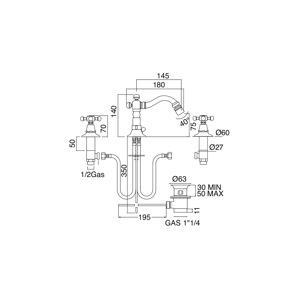 Vintage design 3-håls bidéblandare tillverkad i Italien mässing.