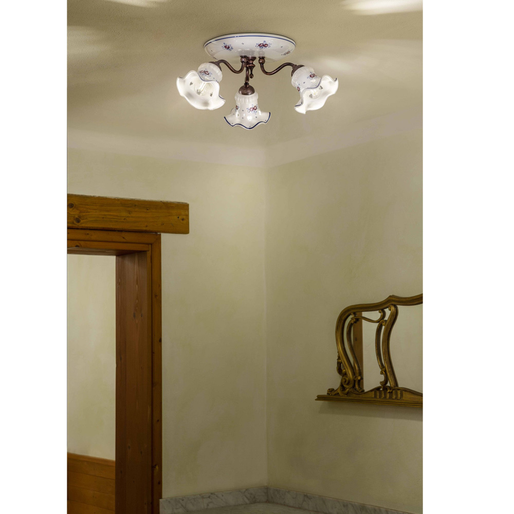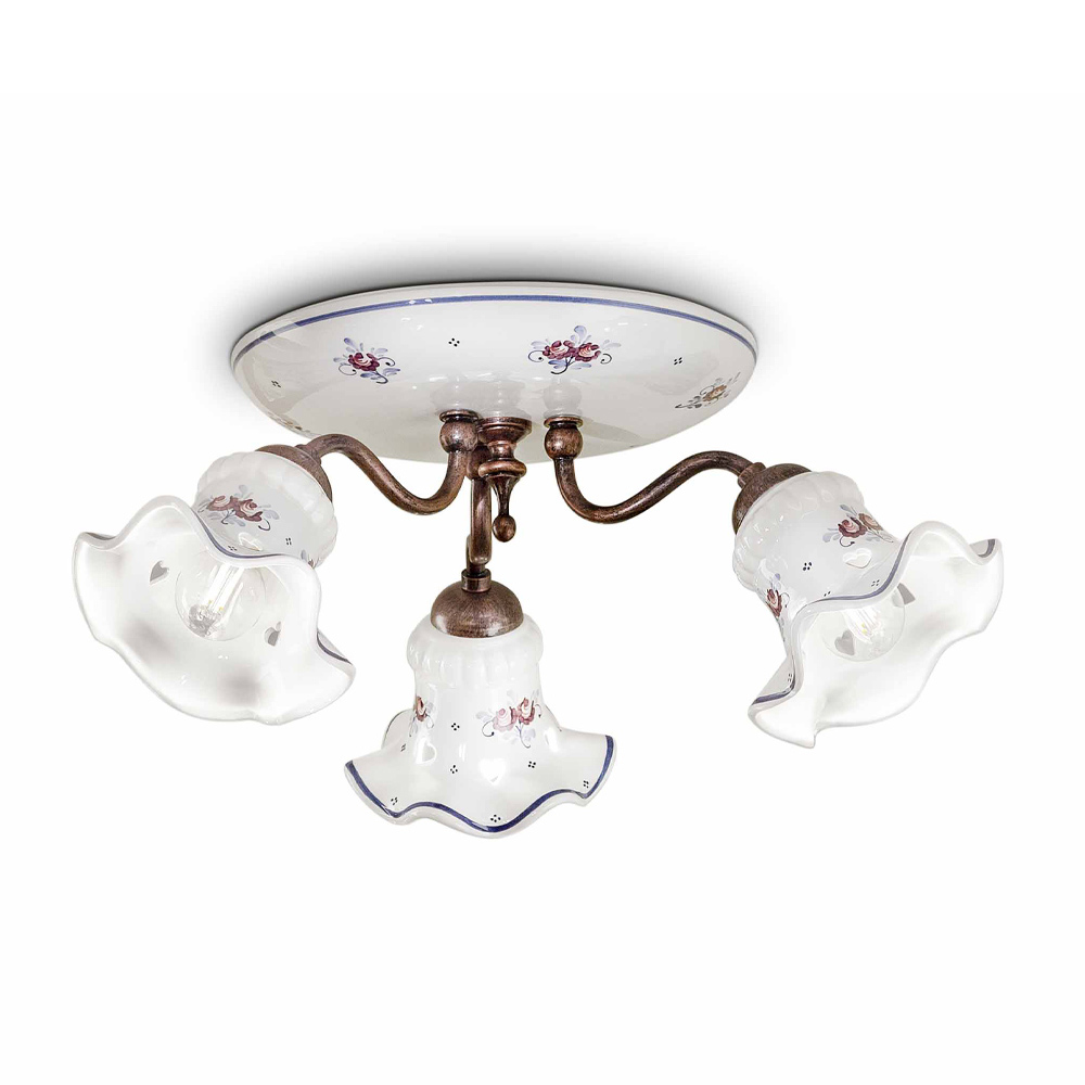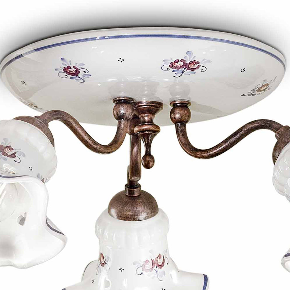 Rund taklampa 3 lampor i järn och handdekorerad keramik, tillverkad i Italien av Ferroluce.