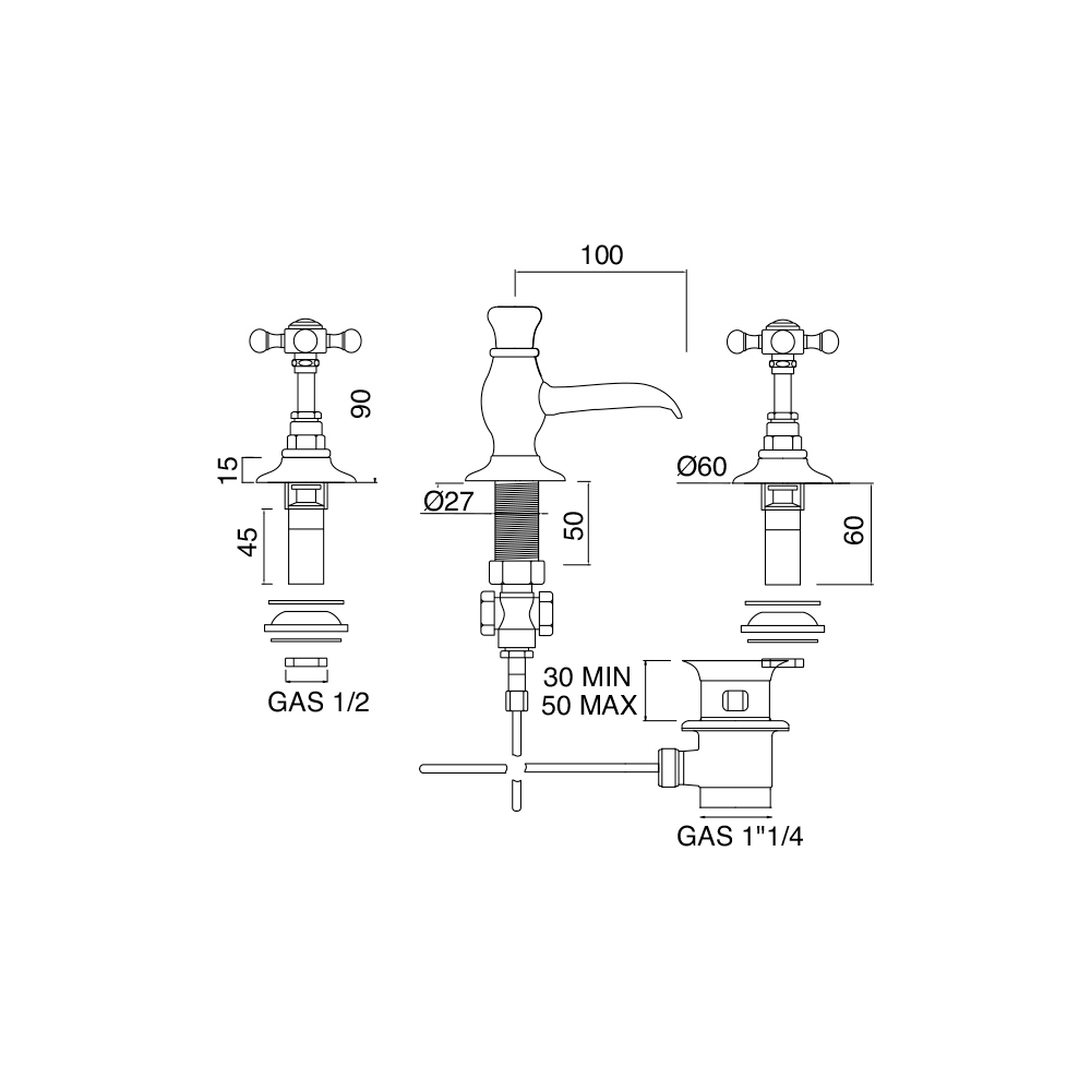 3-håls bidéblandare med avlopp, tillverkad i mässing.