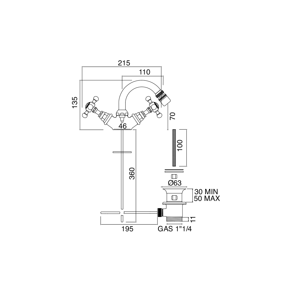 ett-håls bidéblandare med avlopp, tillverkad i mässing.