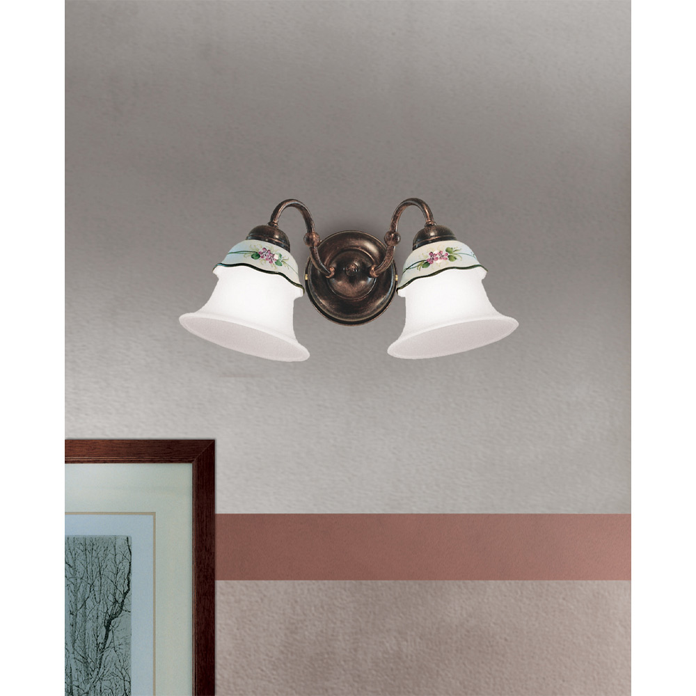 Vägglampa i järn, handdekorerad keramik och syraetsat glas tillverkad i Italien av Ferroluce.