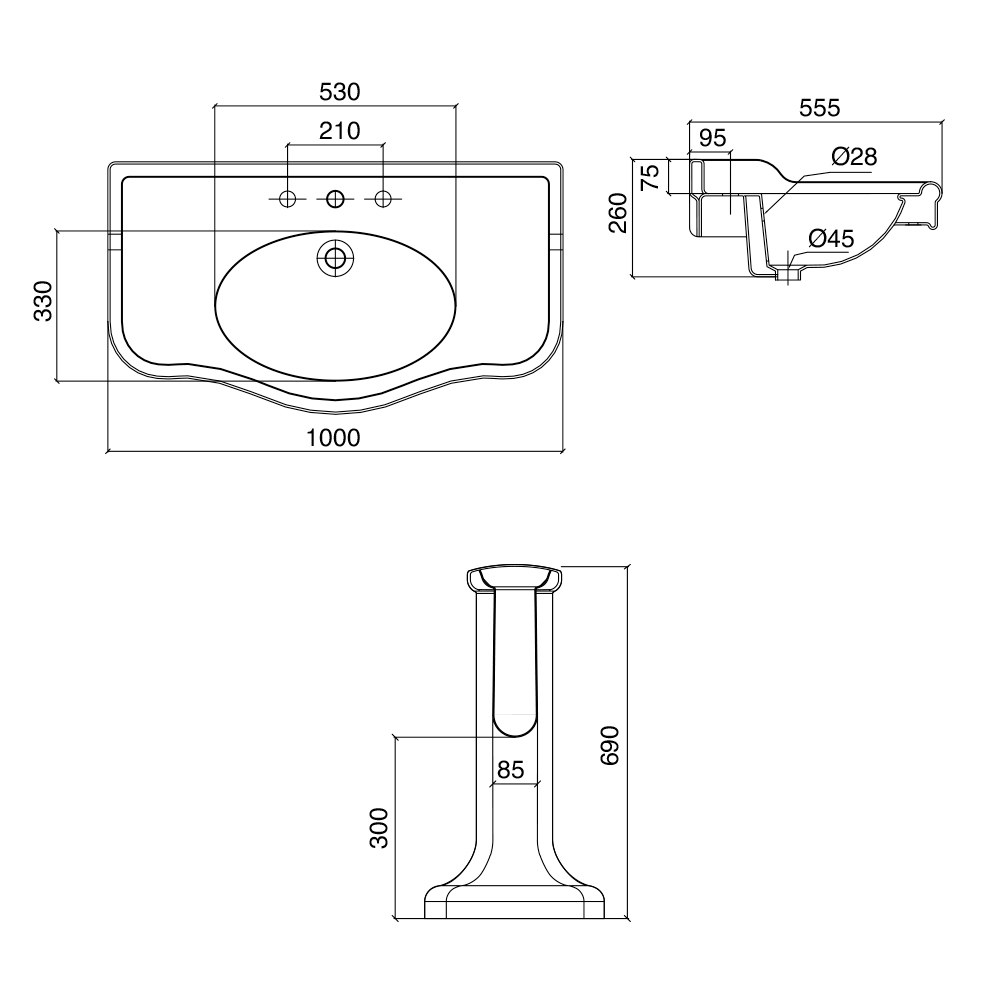 - L 100 x D 55,5 x H 69 cm med stänkskydd och stänkskyddskant 1-3 kranhål - L 1000 mm;