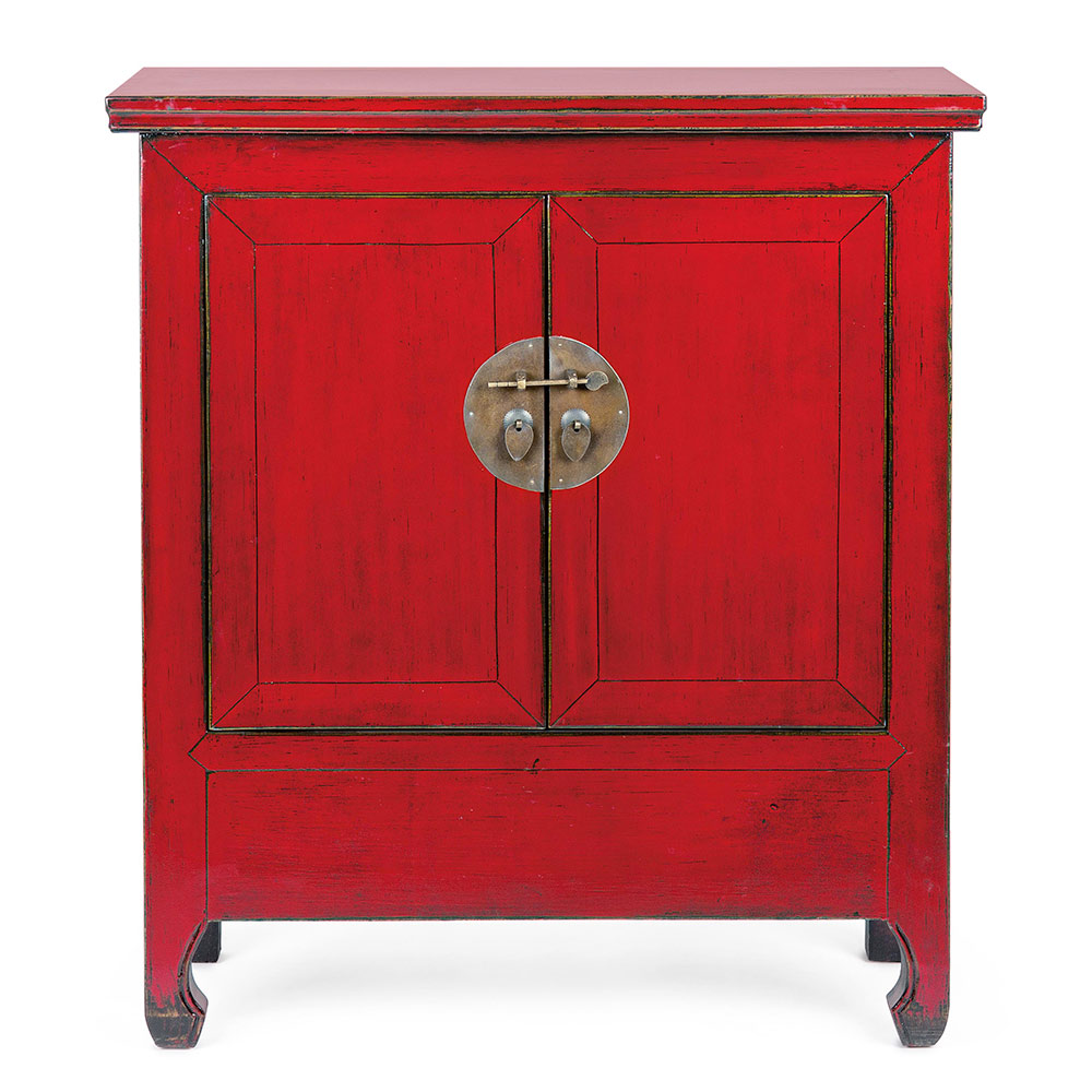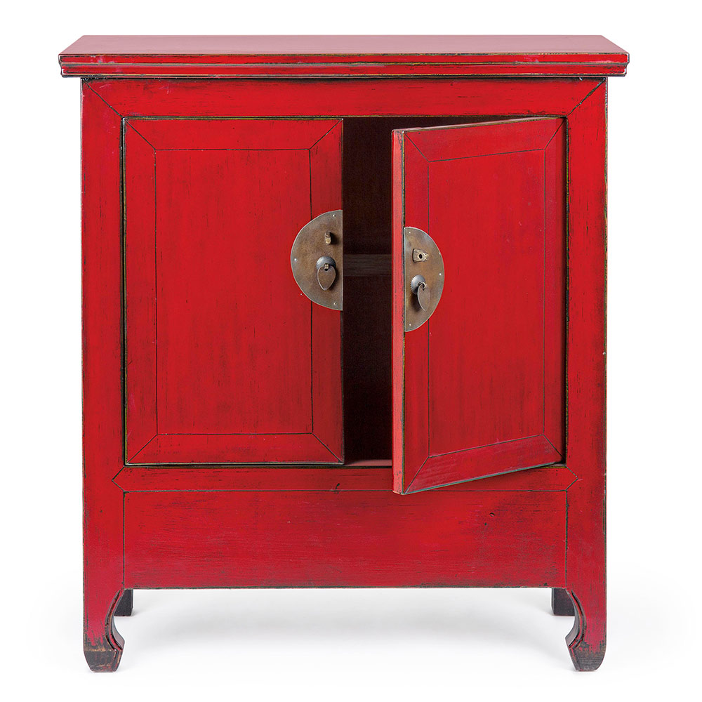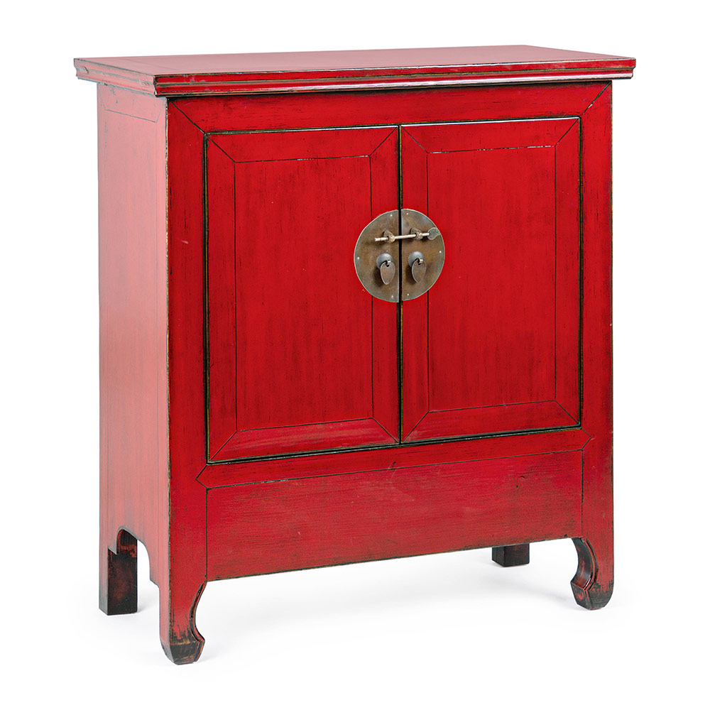 Lågt skåp i rött almträ med 2 dörrar, design i vintagestil.