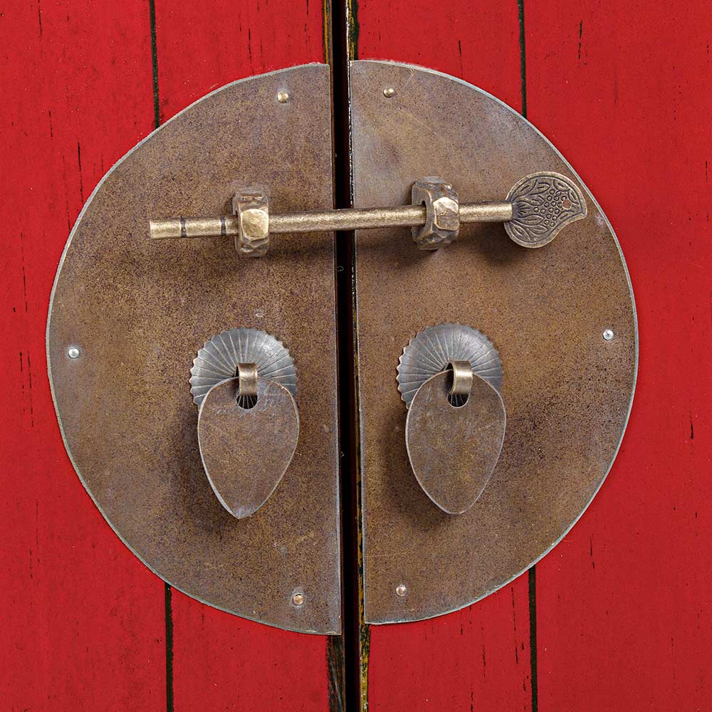 Designen är klar med de praktiska koppar handtagen placeras på 2 dörrar för en tappning utformar resultat med en etnisk touch.