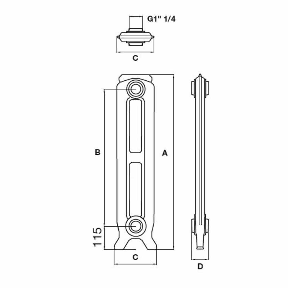 Andra storleksvarianter finns tillgängliga, realiserade genom en samling i batterier från 3 till maximalt 16 element, som kan väljas mellan 2 eller 3 dekorerade kolumner. Inkluderar sidofötter och rostskyddsfärg.