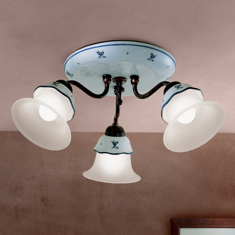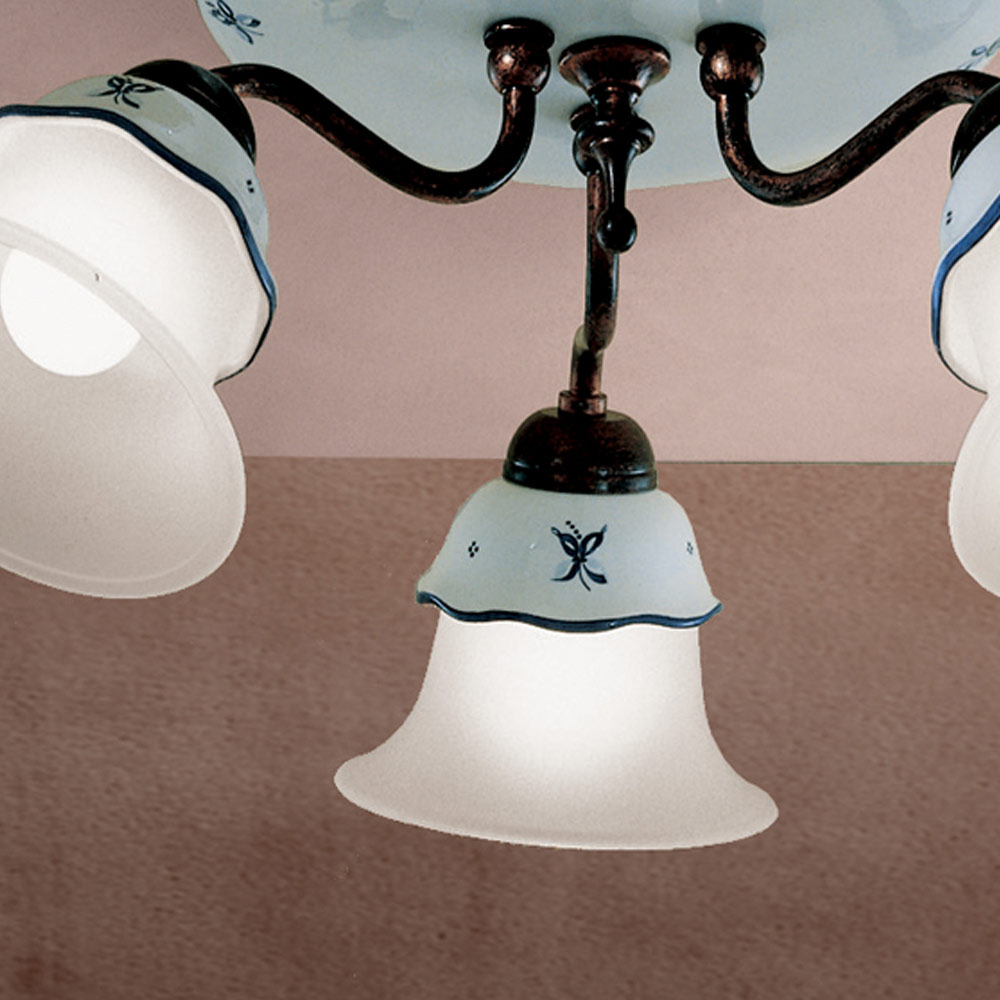 Taklampa i järn, handdekorerad keramik och syraetsat glas tillverkad i Italien av Ferroluce.