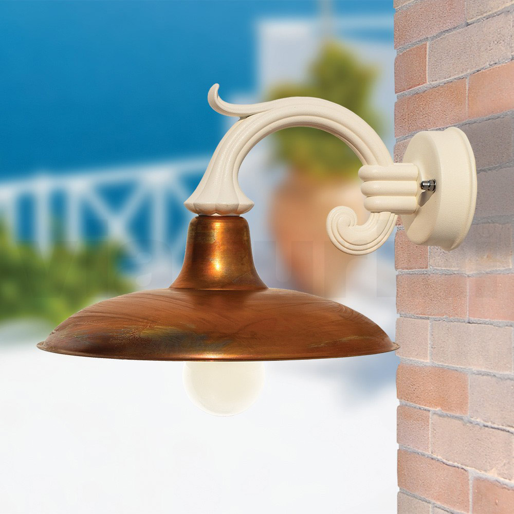 Vägglampa med präglad vit pressgjuten aluminiumstruktur och diffusor i naturlig mässing (d. 260 mm) tillverkad genom 100 % tillverkad i Italien . Komplett med rostfria skruvar och silikonpackning för bättre skydd. Förfining och effektivitet är de viktigaste egenskaperna hos denna möbel med en eklektisk personlighet, idealisk för att möblera och göra alla utomhusutrymmen elegant och exakt. Idealisk för miljöer som trädgårdar, innergårdar, alléer och gångvägar men även kontraktsutrymmen som barer och restauranger.