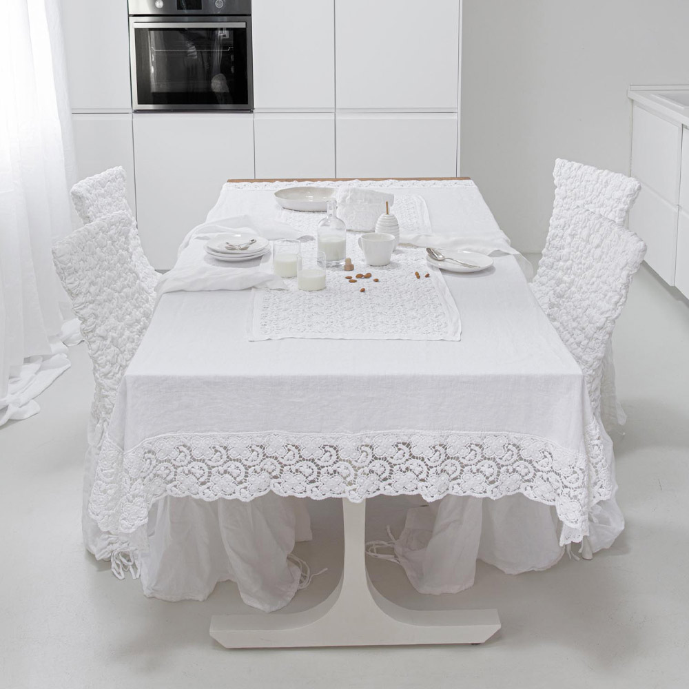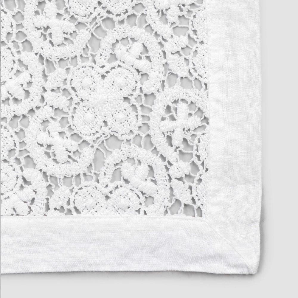 Bordslöpare i virkad spets med kant i linne och bomullsblandning, lyxig design tillverkad i Italien.