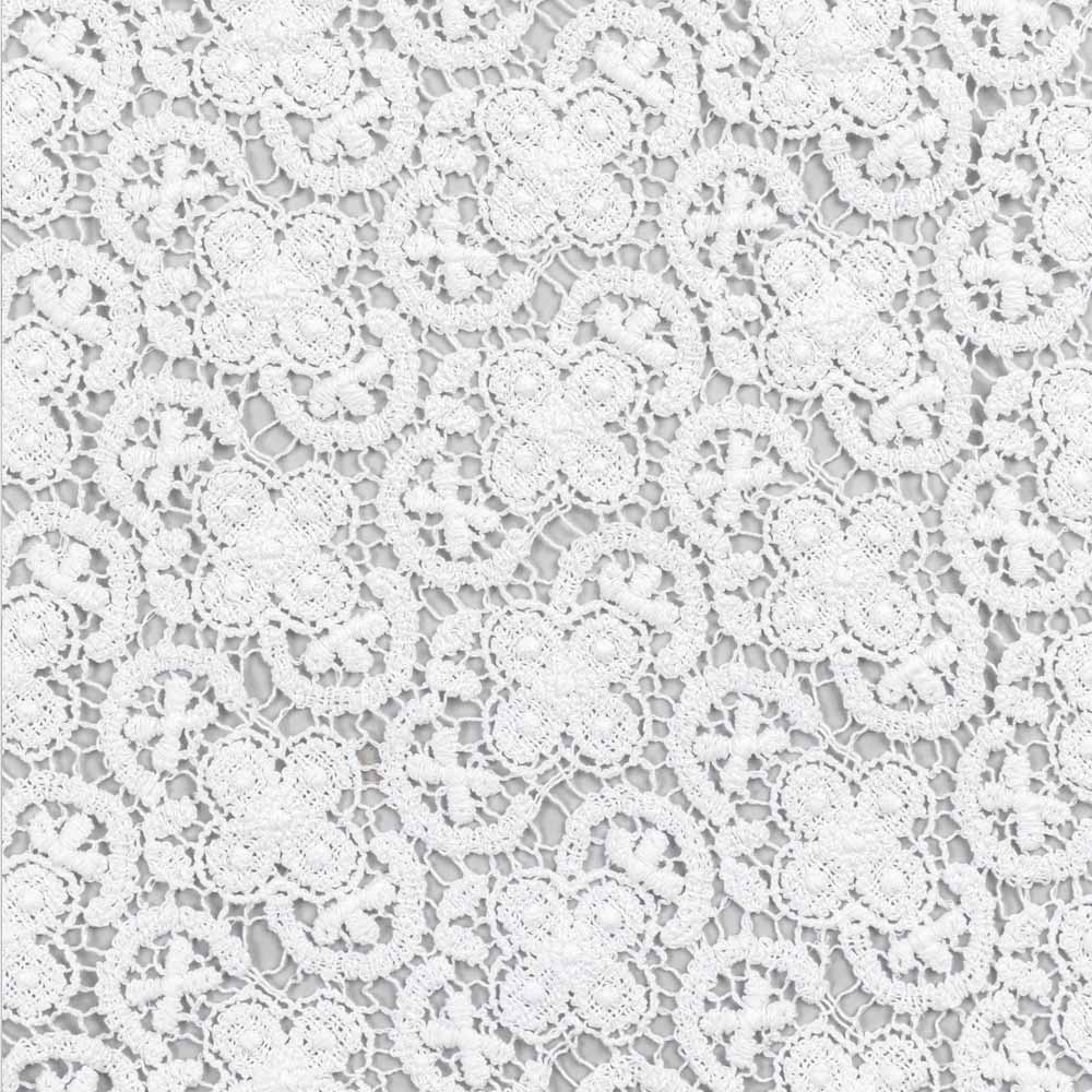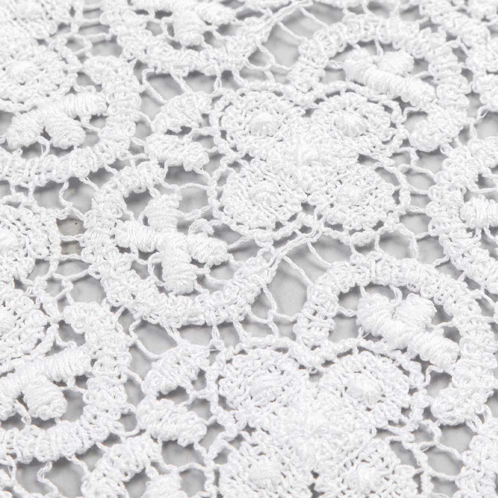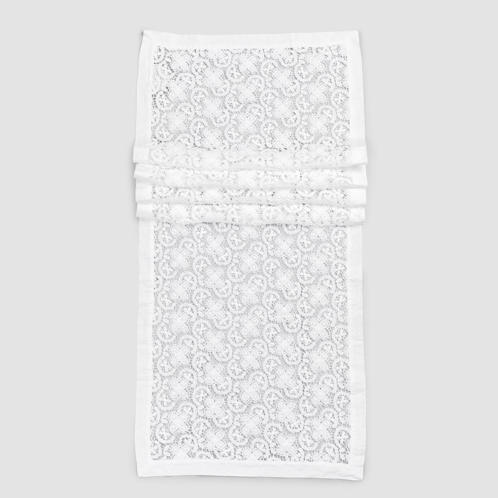 Den vita dekorationslöparen är helt broderad i virkad spets och har en linne- och bomullsblandad kant med veck.