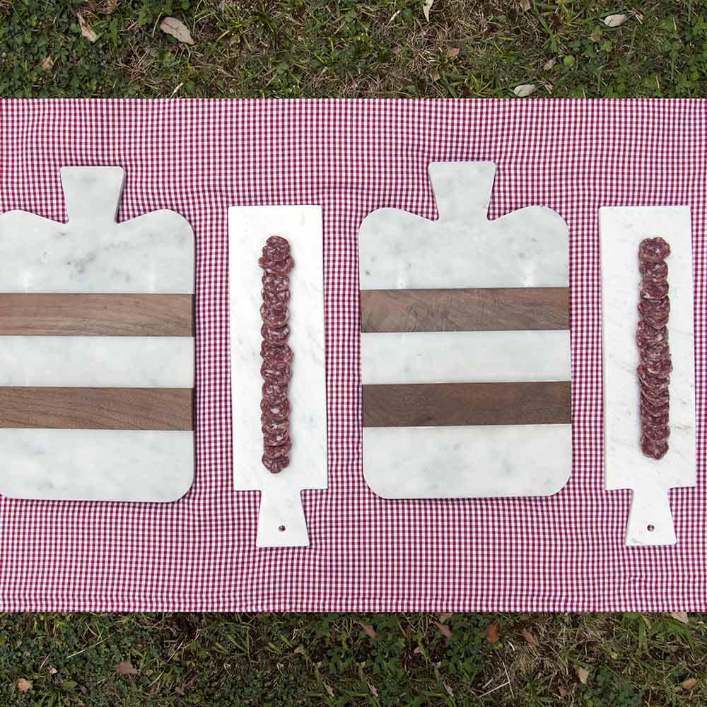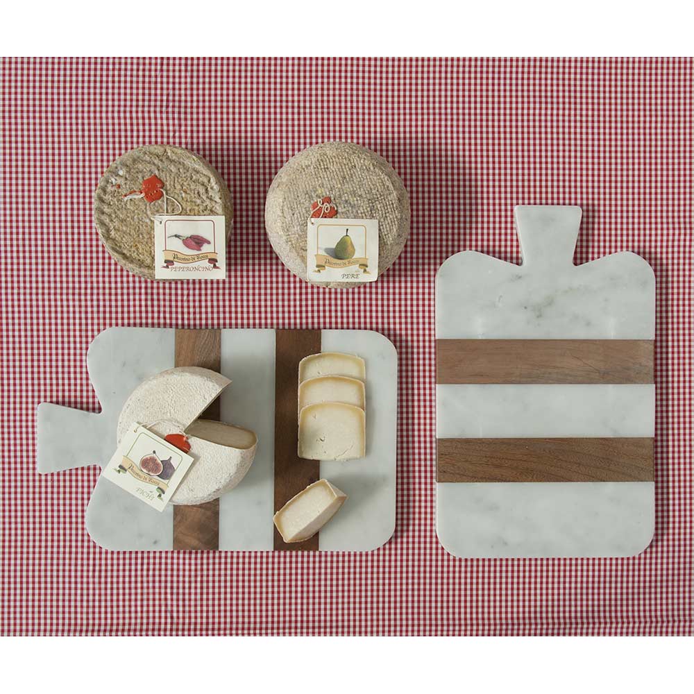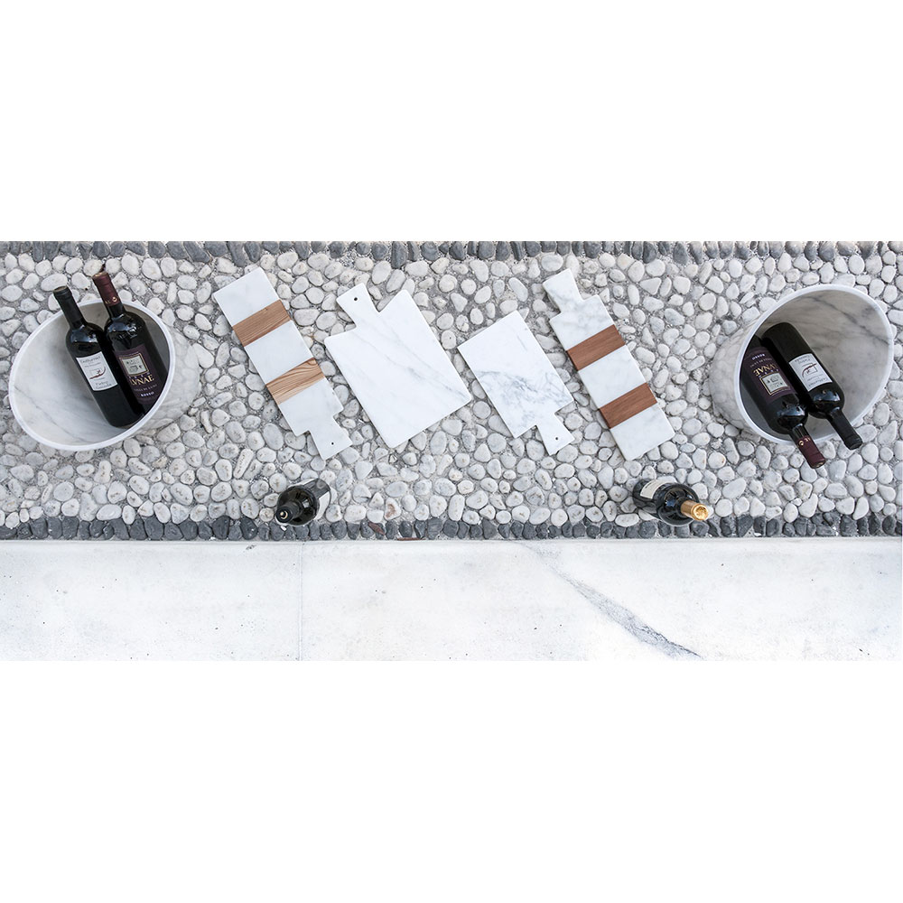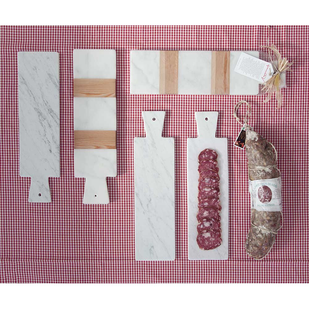 Rektangulär skärbräda finns i två storlekar som kännetecknas av hög kvalitet vit Carrara-marmor används för dess förverkligande och av träinsatserna . Det innehåller också ett praktiskt hål på handtaget för upphängning.