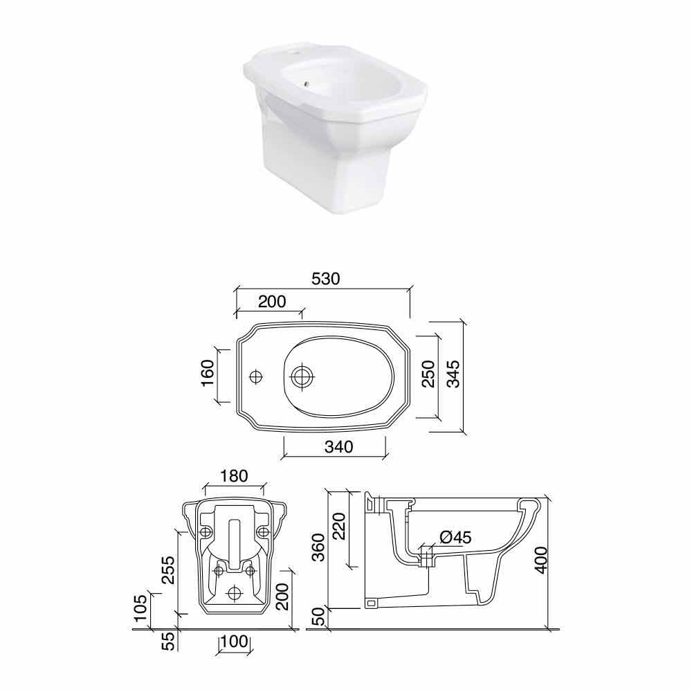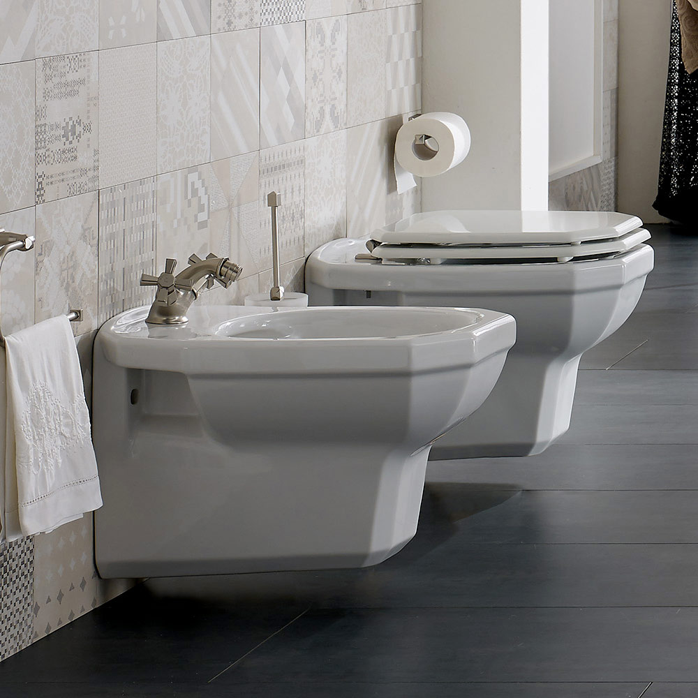 Vägghängd bidé tillverkad i Italien i vit keramik, klassisk stil, Nausica.