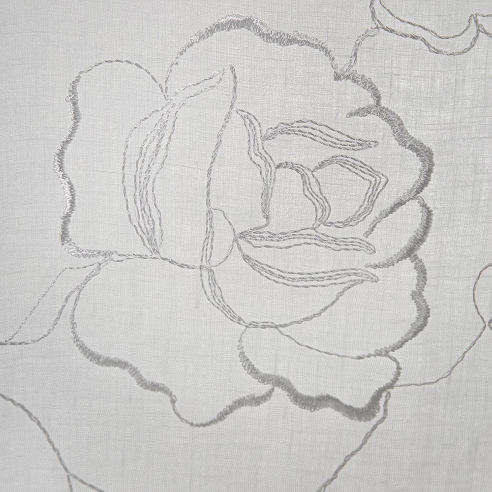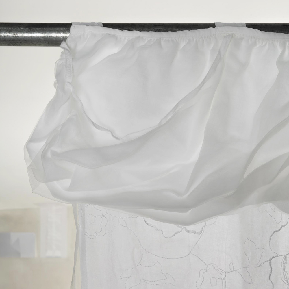vita gardinen i linnegas och organza med broderade rosor och upprullat tyg i kombination med ringar för stav.