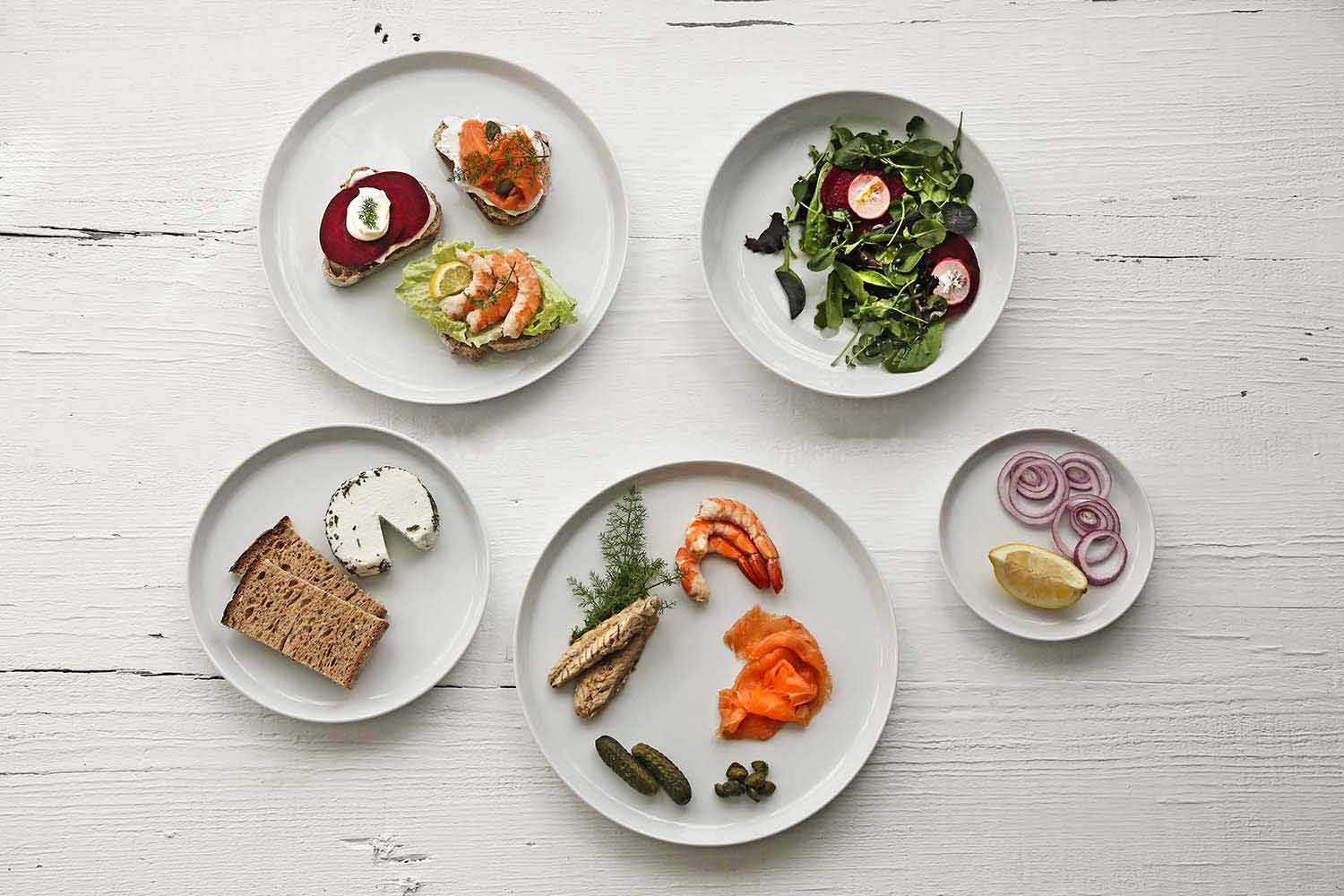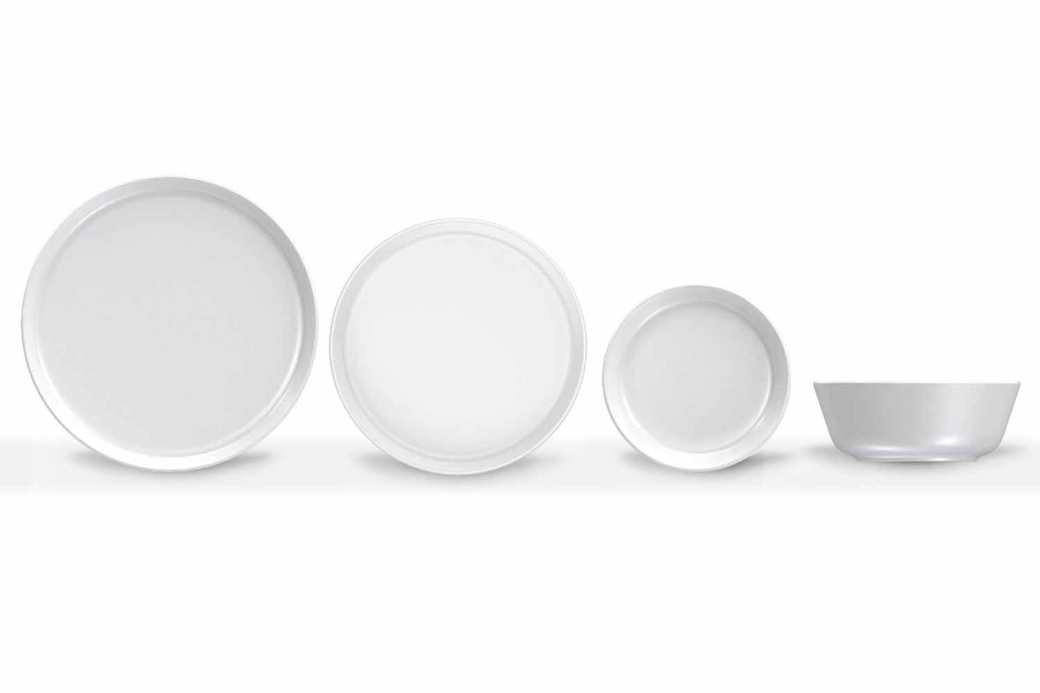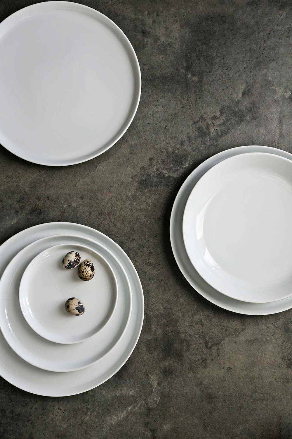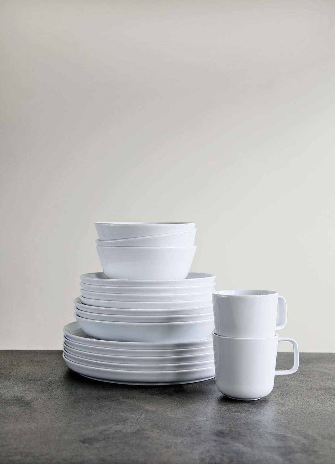 Komplett uppsättning moderna matplattor i skandinaviskt inspirerat porslin, 24 stycken.