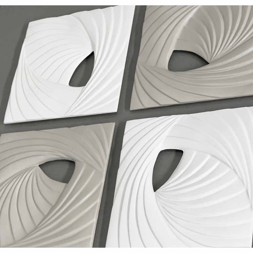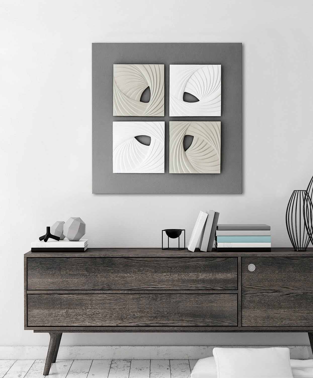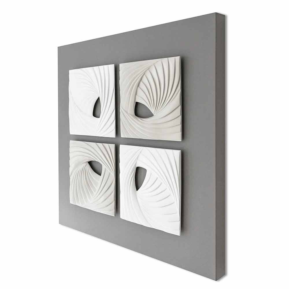 Väggdekoration för modern design basrelief av vitt och grått keramiskt överhäng på duk, tillverkat i Italien.