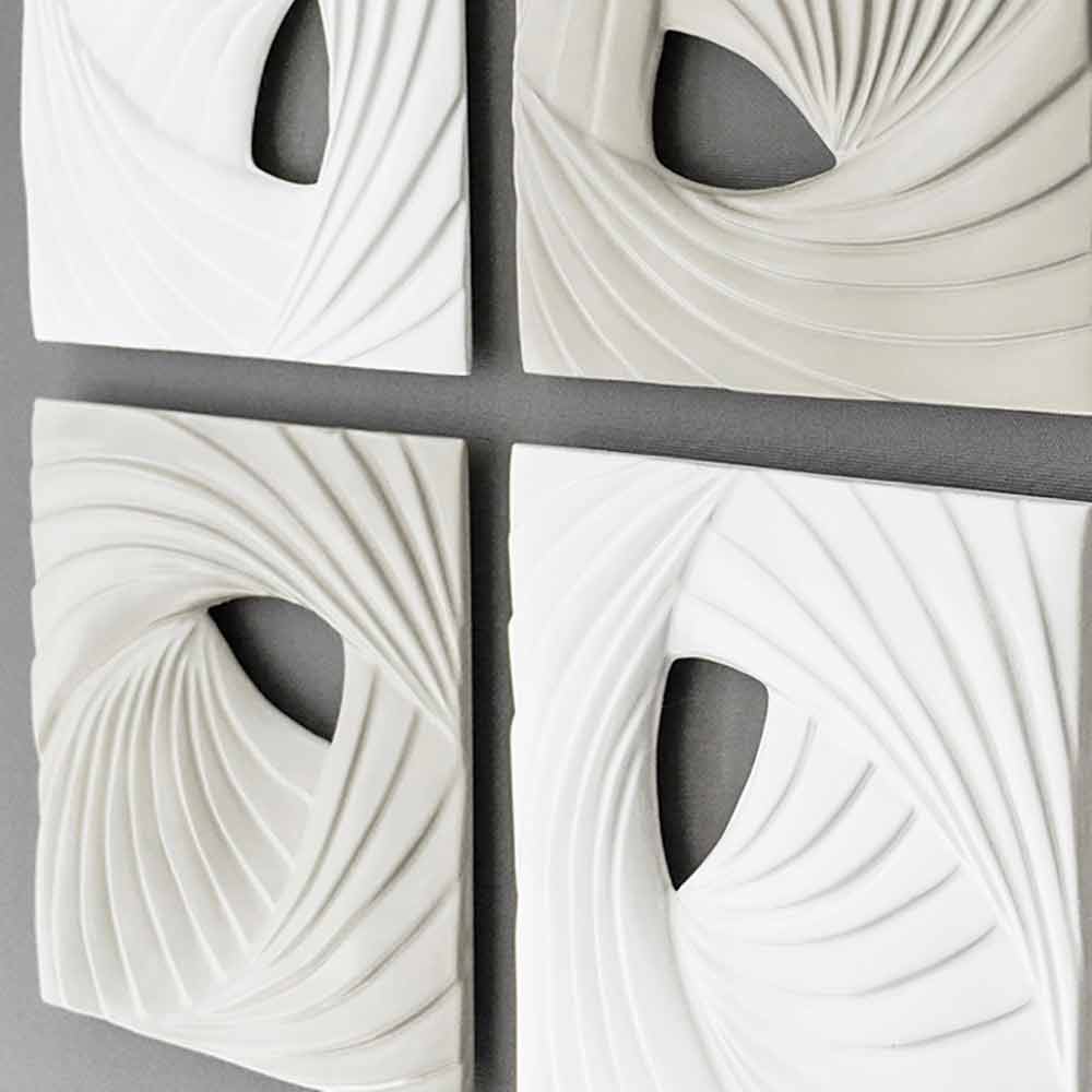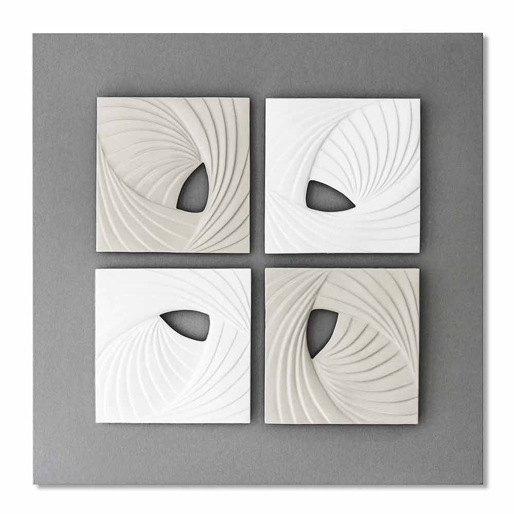 vägginstallation i keramiska komposit är sammansatt av fyra element med eleganta linjer och moderna former i elfenbensvit och silke grå monterad överhängande på sten grålackerad duk. Resultatet är med en minimal och dekorativ estetisk inverkan för en unik stil.
