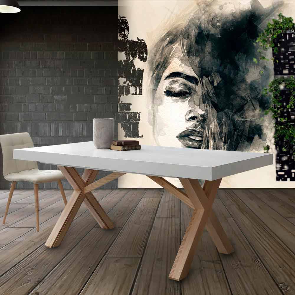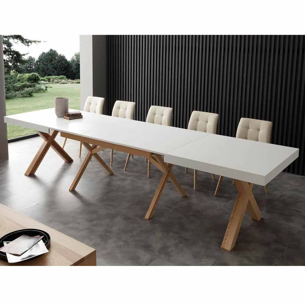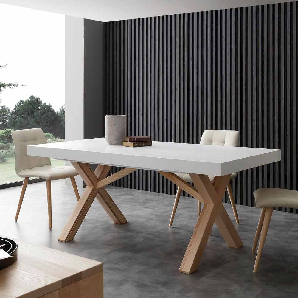 Ricos estetik spelas på kontrasten mellan det svala vita på toppen och den naturligt betsade massiva trästrukturen. Det är idealiskt för dem som älskar att ta emot vänner och släktingar till lunch eller middag. Rico kan förlängas i 3 steg: 240, 300 eller 360 cm i längd.