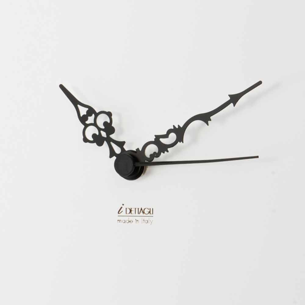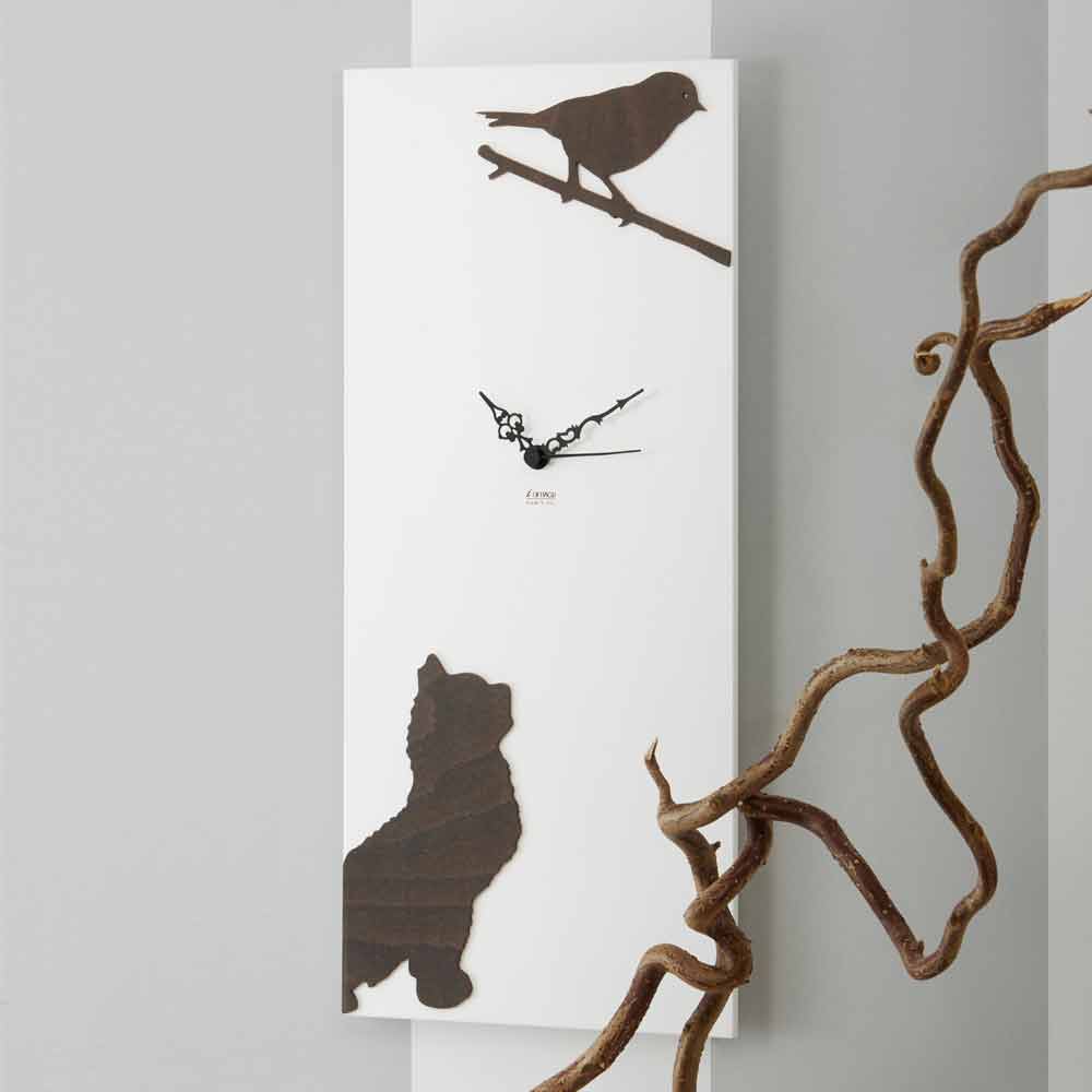 Rektangulär väggklocka i matt vitt trä med fågel- och kattdesign, modern design tillverkad i Italien.