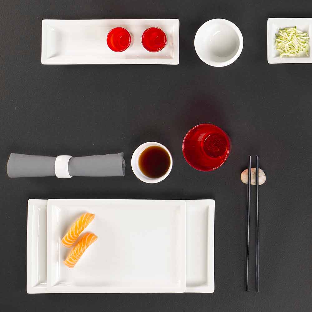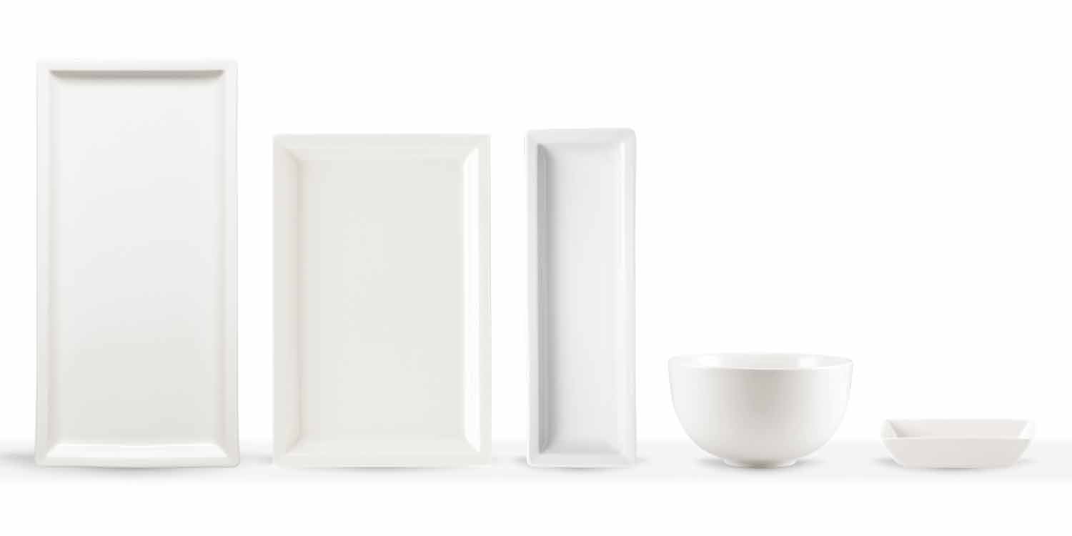 Rätter för bordet med modern design, i rektangulärt vitt porslin, komplett med 25 delar.