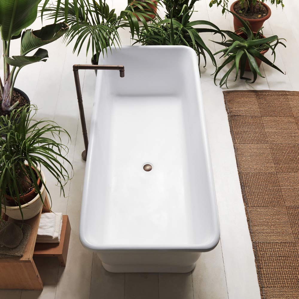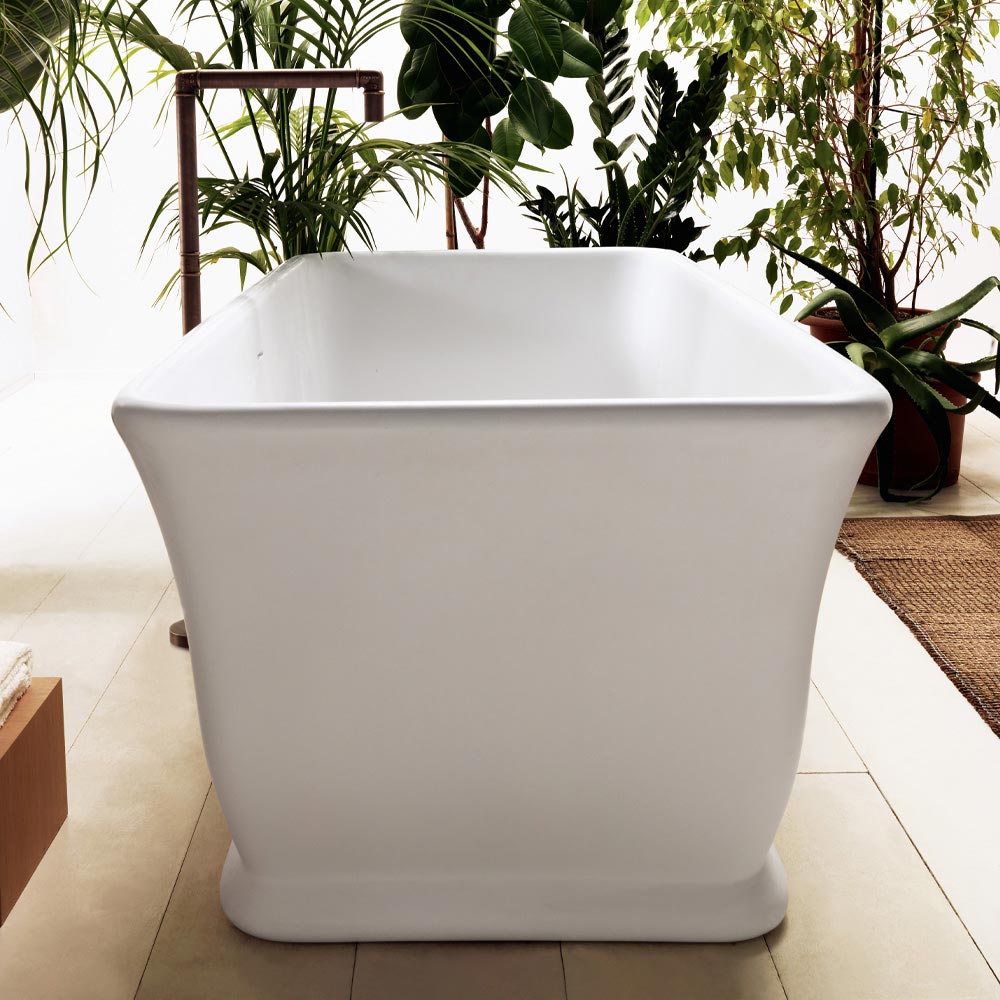 Vitt badkar i Solid Surface , en blandning av akrylharts modifierad med mineralföreningar, med integrerat bräddavlopp . Badkar tillägnat älskare av det traditionella clawfoot badkaret. Val av matt eller blank vit. Kompositionsblandningen låter denna karakteristiska färg komma ut. Denna blandning är också mycket förnybar, homogen och 100 % icke-porös och därför vattentät.