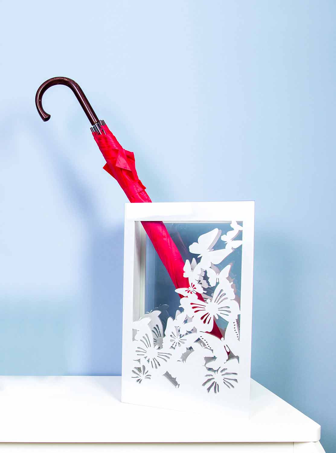 golvparaplystället i format lackat trä som visar en hög med eleganta fjärilar.